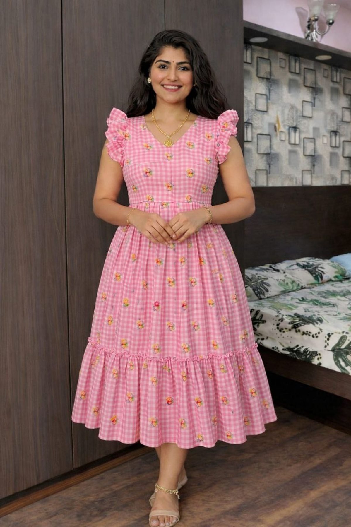 Luxury Pink Chanderi Cotton Silk Designer Printed Gown for Boutique Collection