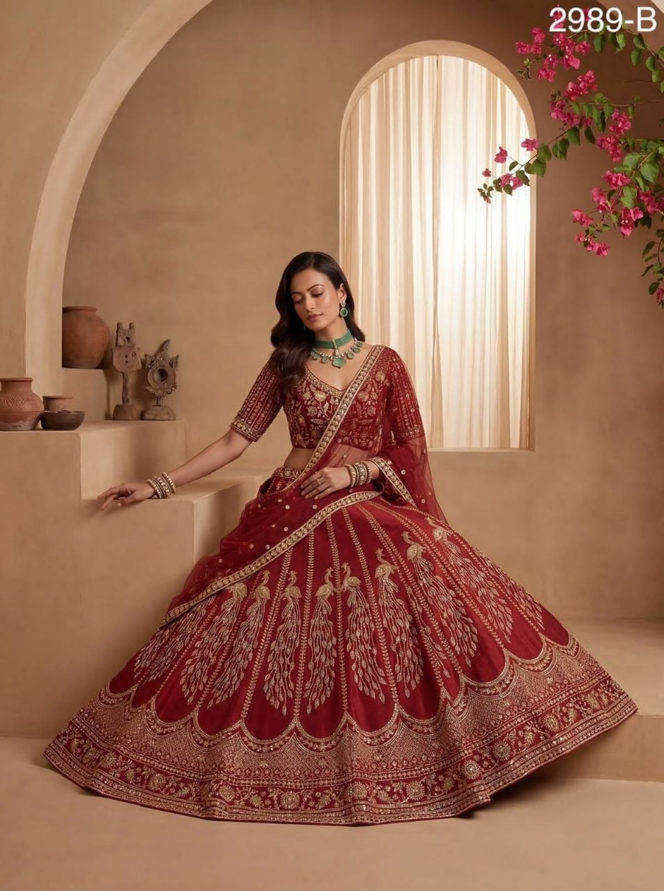 Luxury bridal lehenga crafted in premium silk featuring intricate handwork motifs, crystal detailing, zari, multi-thread embroidery, dori, and sequins work. Designed with a grand 4+ meter flair and heavy cancan, this outfit offers a rich royal look, perfect for weddings, bridal wear, and grand occasions.