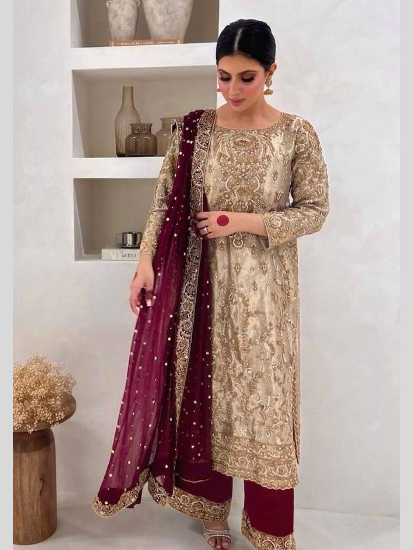 Luxury Silk Embroidery Suit Palazzo Dupatta Set Perfect for Weddings