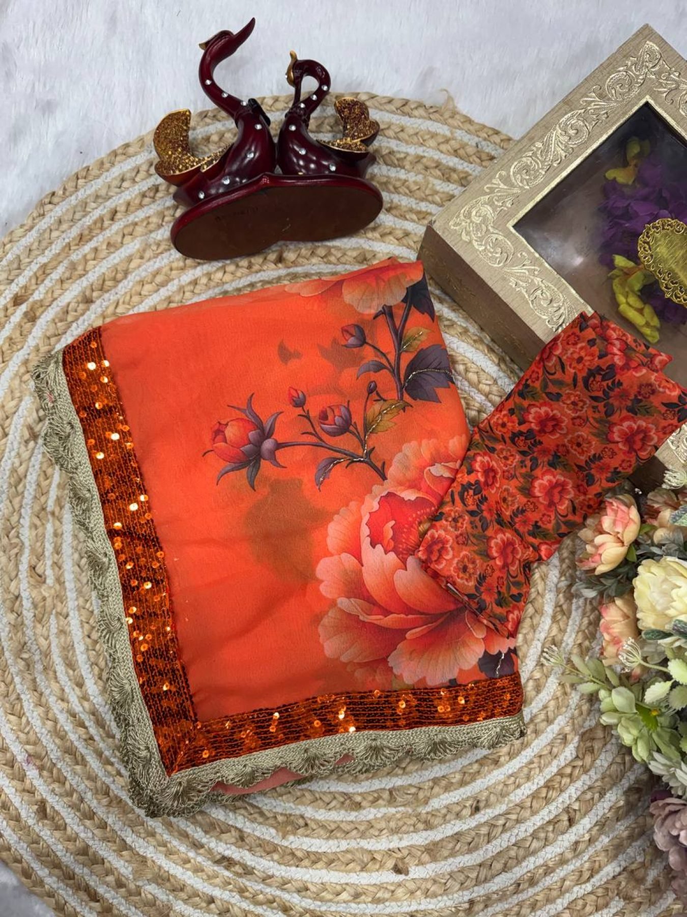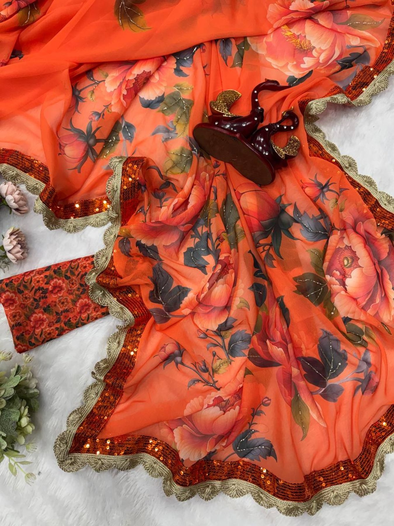 Stylish soft georgette saree featuring beautiful floral print with sequins work, katdana handwork, and fancy lace border. Designed for a graceful and modern look, perfect for sangeet, cocktail parties, and festive occasions.