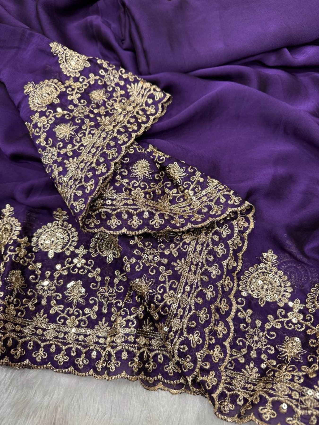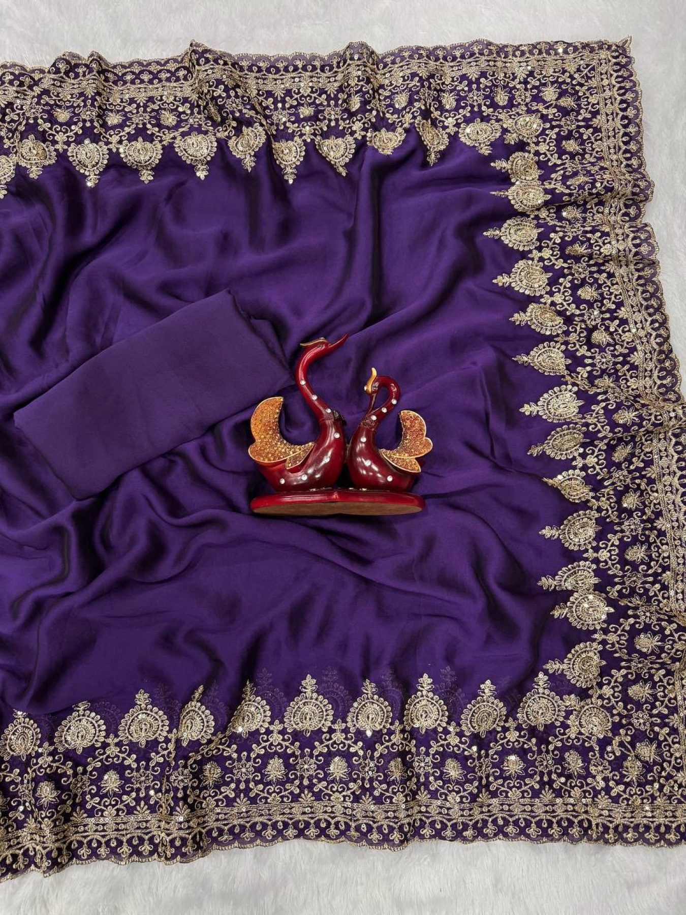 Elegant Bollywood-style saree crafted in soft Rangoli silk, featuring intricate sequence and zari embroidery. Designed with fine handcrafted detailing, this saree offers a graceful and sparkling look, perfect for weddings, parties, and festive occasions.