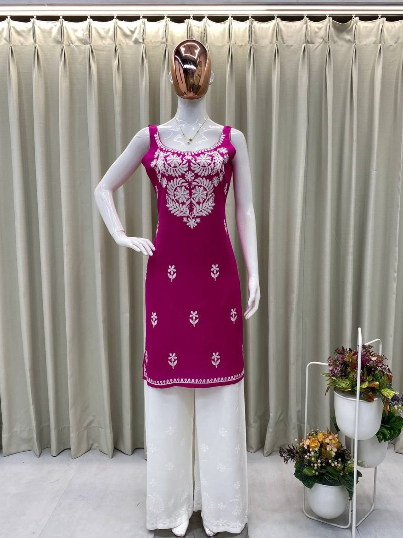 Magenta Pink Chikankari Kurti Set with White Palazzo Vibrant Look for Elegant Days