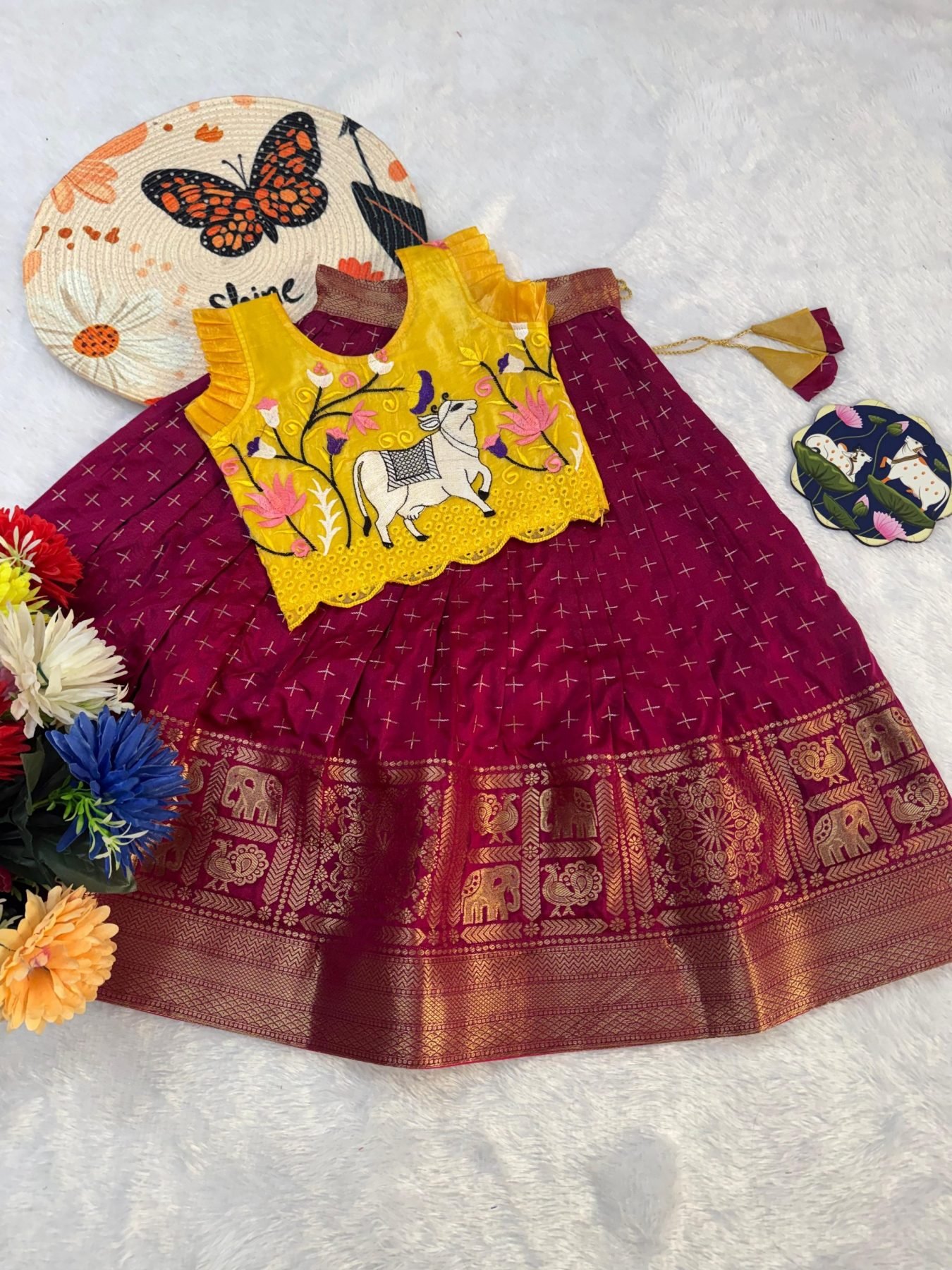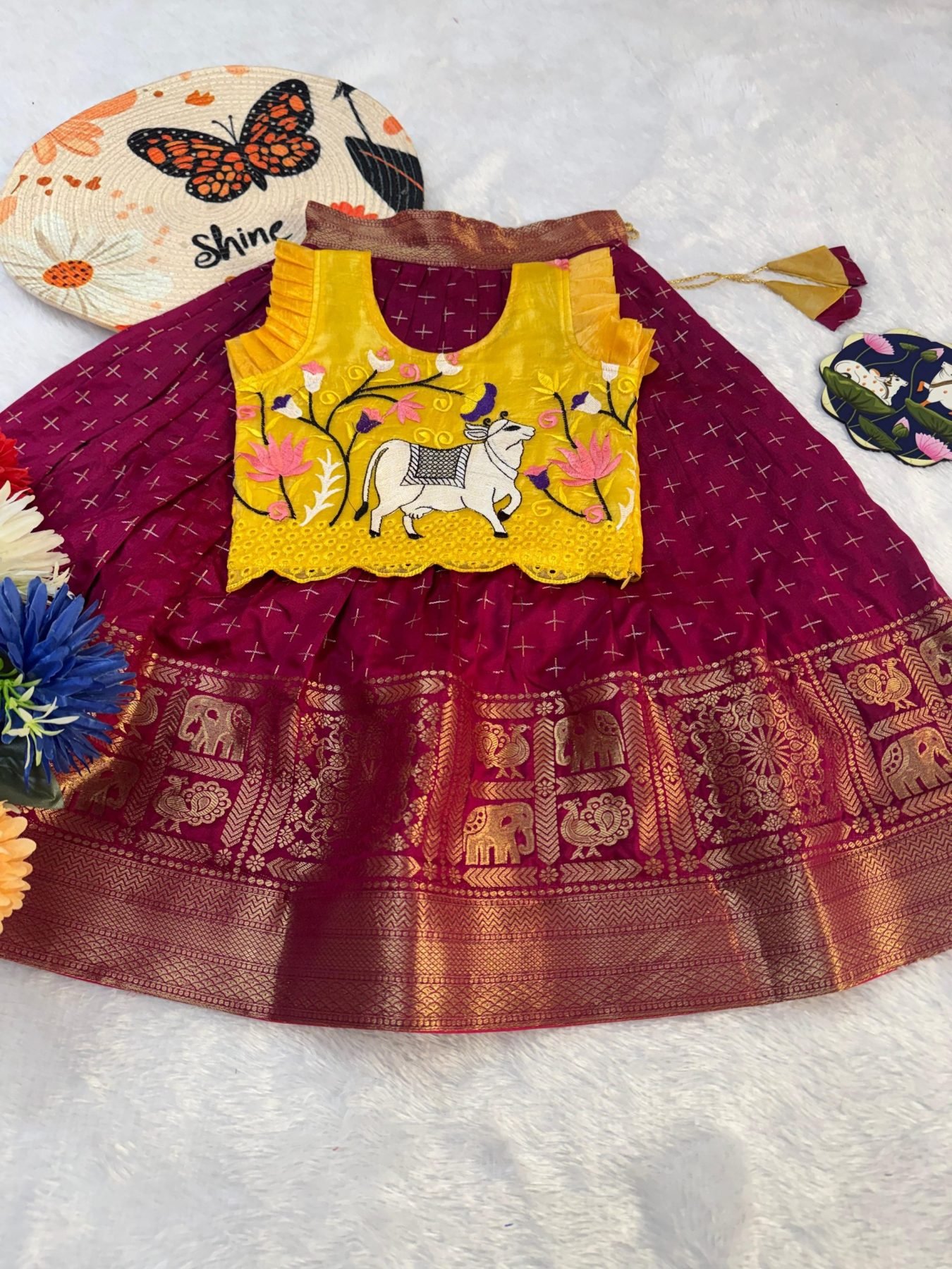 Beautiful kids lehenga set designed with elegant weaving work and jacquard border, paired with a stylish pichwai embroidery blouse. Perfect for weddings, festive wear, and traditional functions.