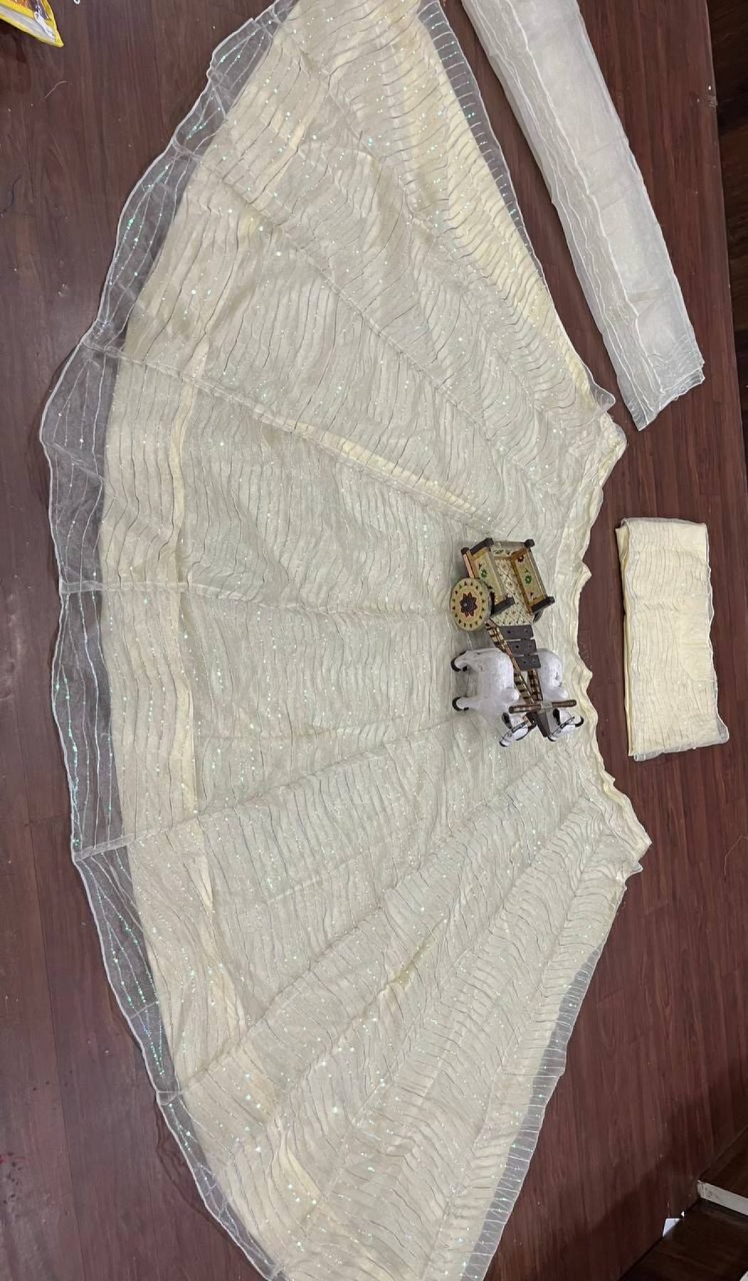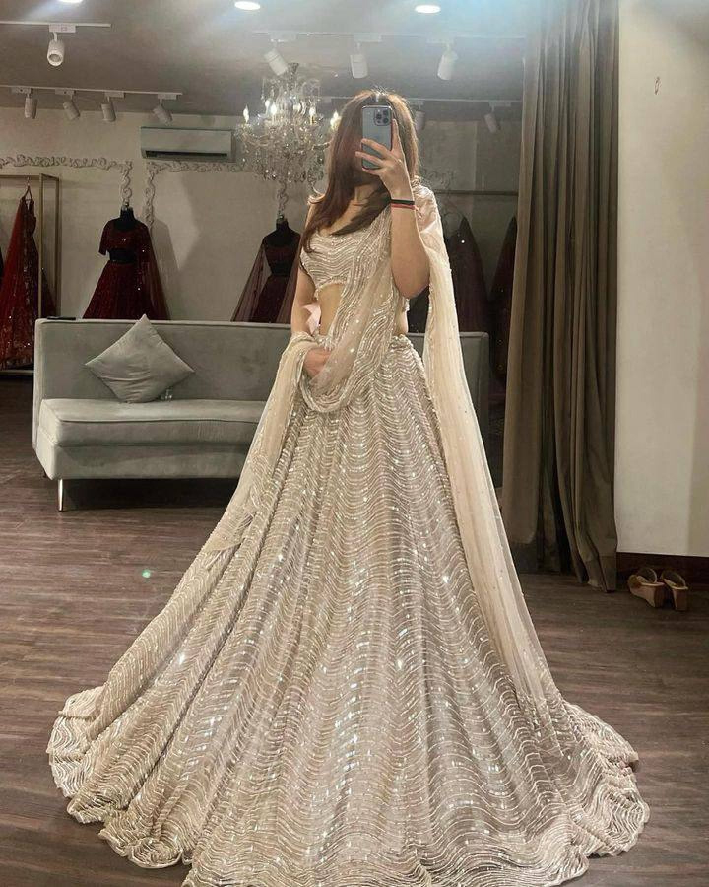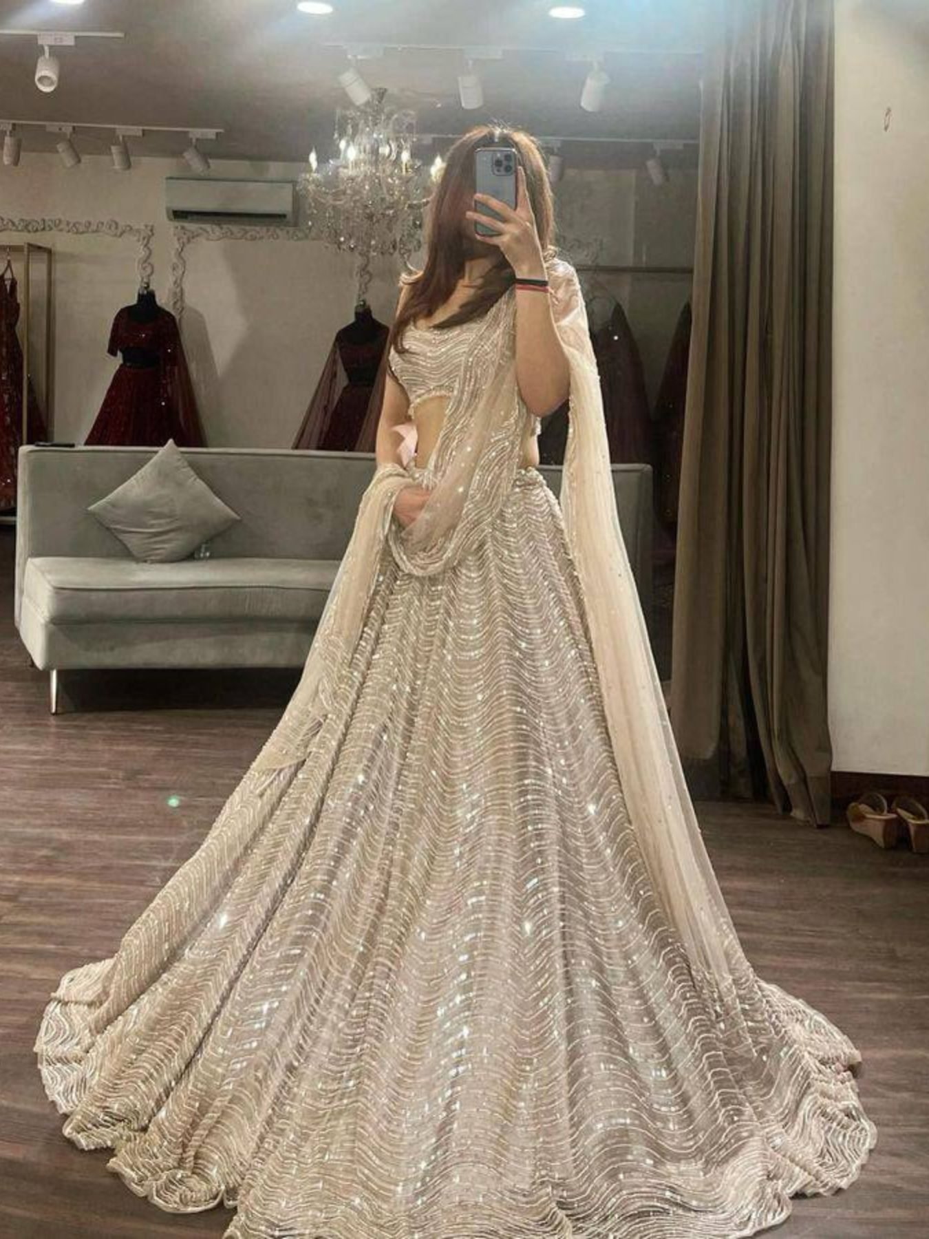 Elegant organza silk lehenga set featuring sequins work with heavy flare paired with matching blouse and dupatta. Lightweight and perfect for wedding and festive occasions.