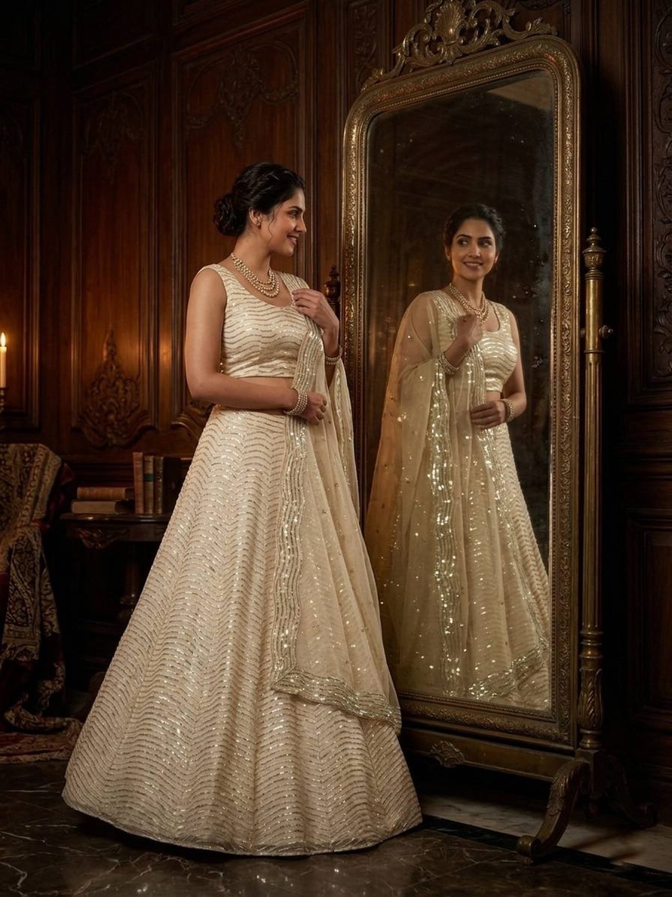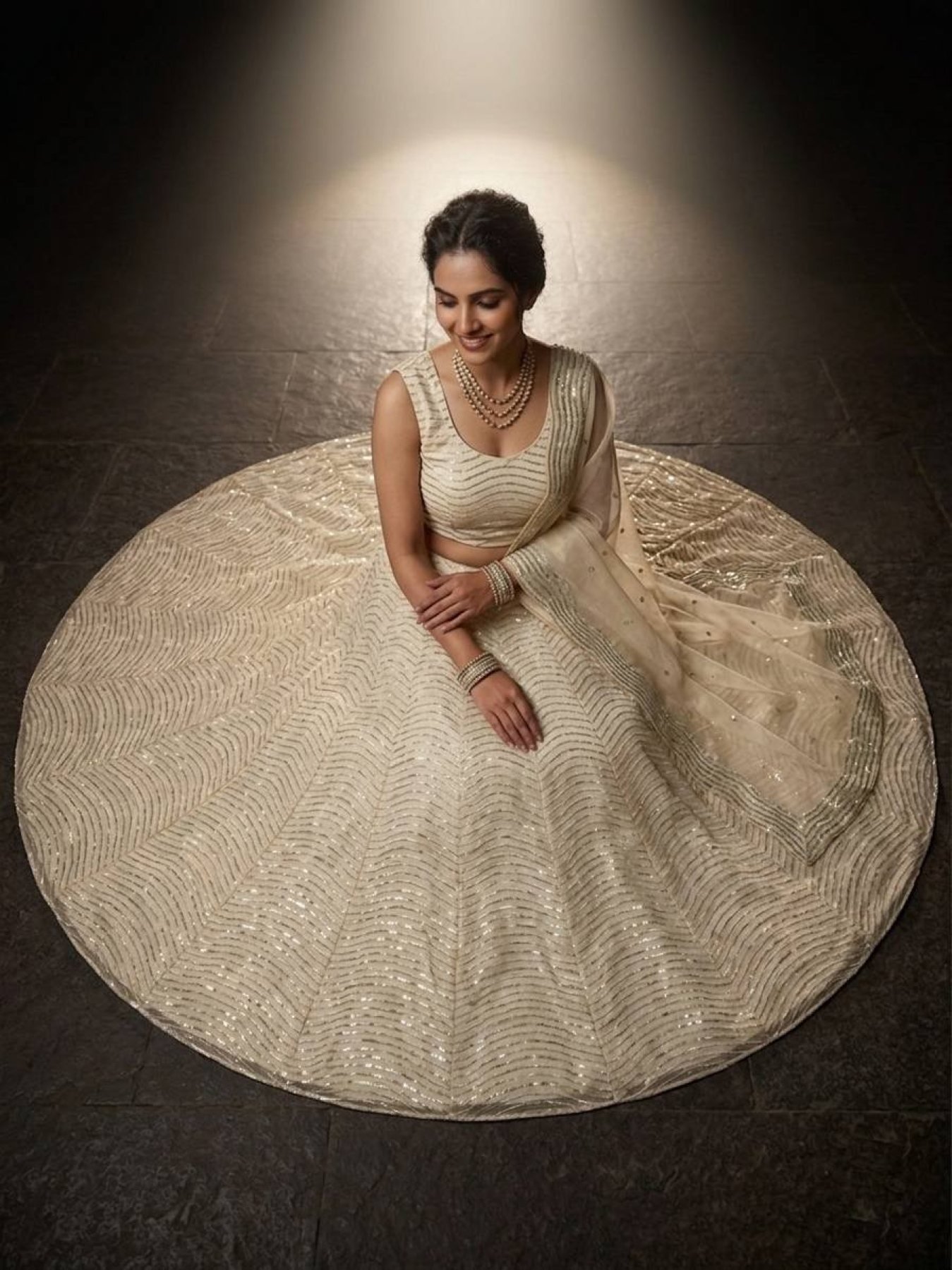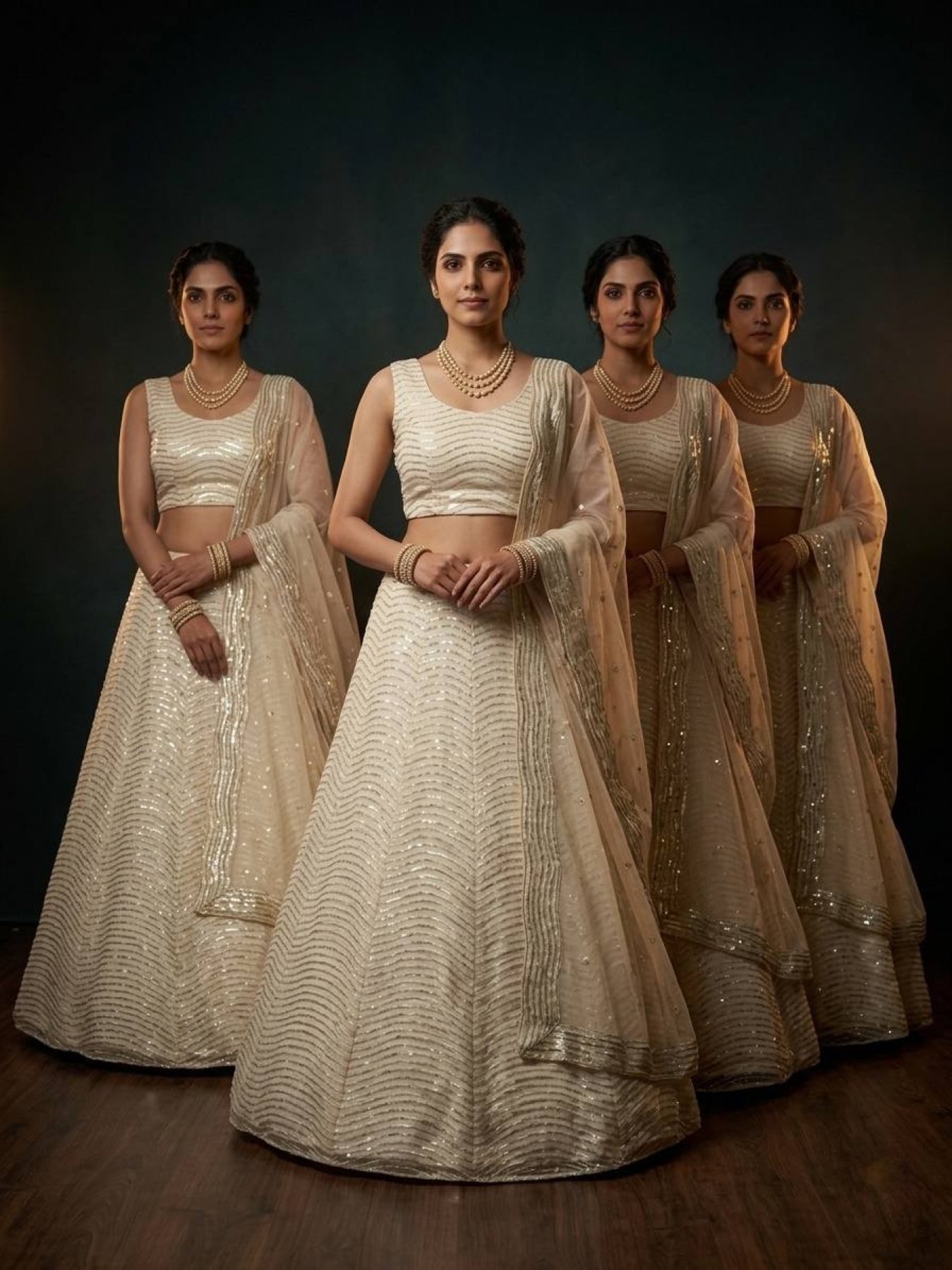 Elegant organza silk lehenga set featuring sequins work with heavy flare paired with matching blouse and dupatta. Lightweight and perfect for wedding and festive occasions.