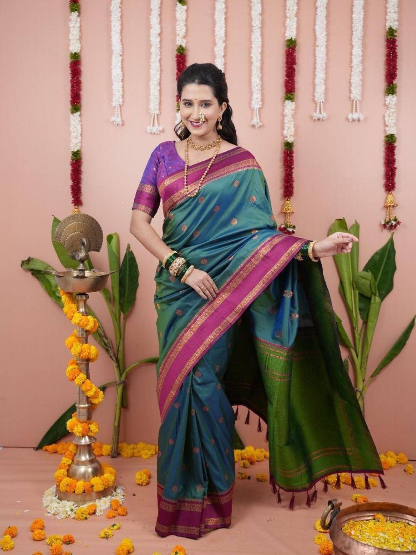 Maharashtra Style Green Soft Silk Saree with Dual Zari Motifs and Designer Border