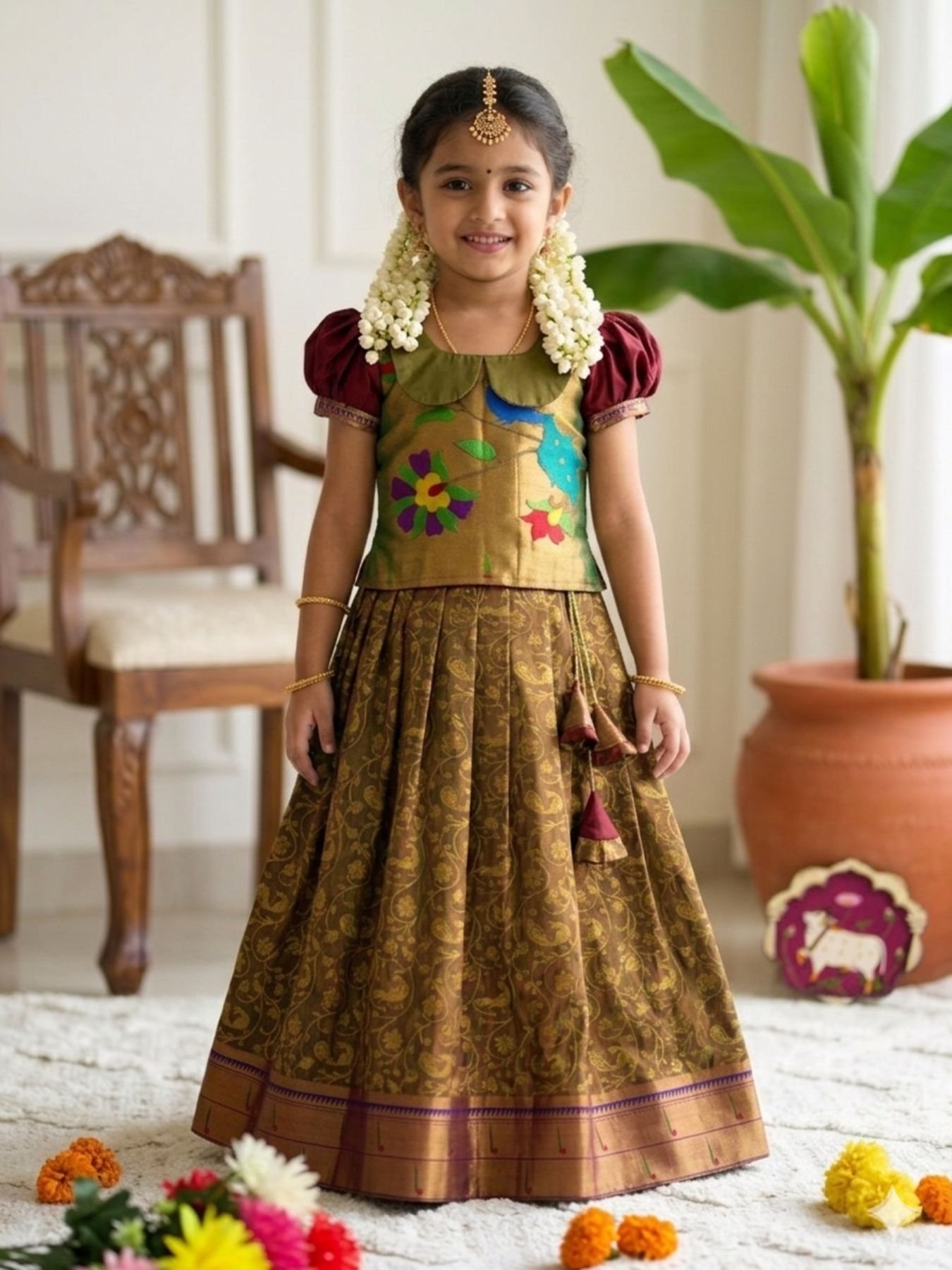 Elegant kids lehenga set featuring fancy meena and golden zari weaving work with a beautiful muniya border. Comes with a fully stitched blouse with zari detailing and fancy pasting, perfect for weddings and festive occasions.