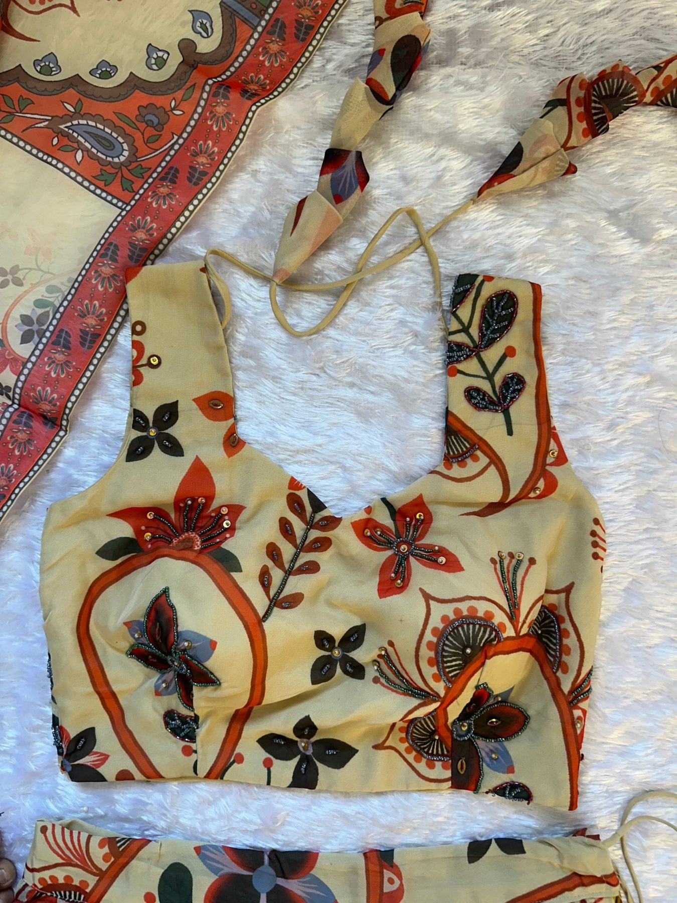 Majestic Cream Floral Printed Lehenga with Sleeveless Blouse for Festive Wear