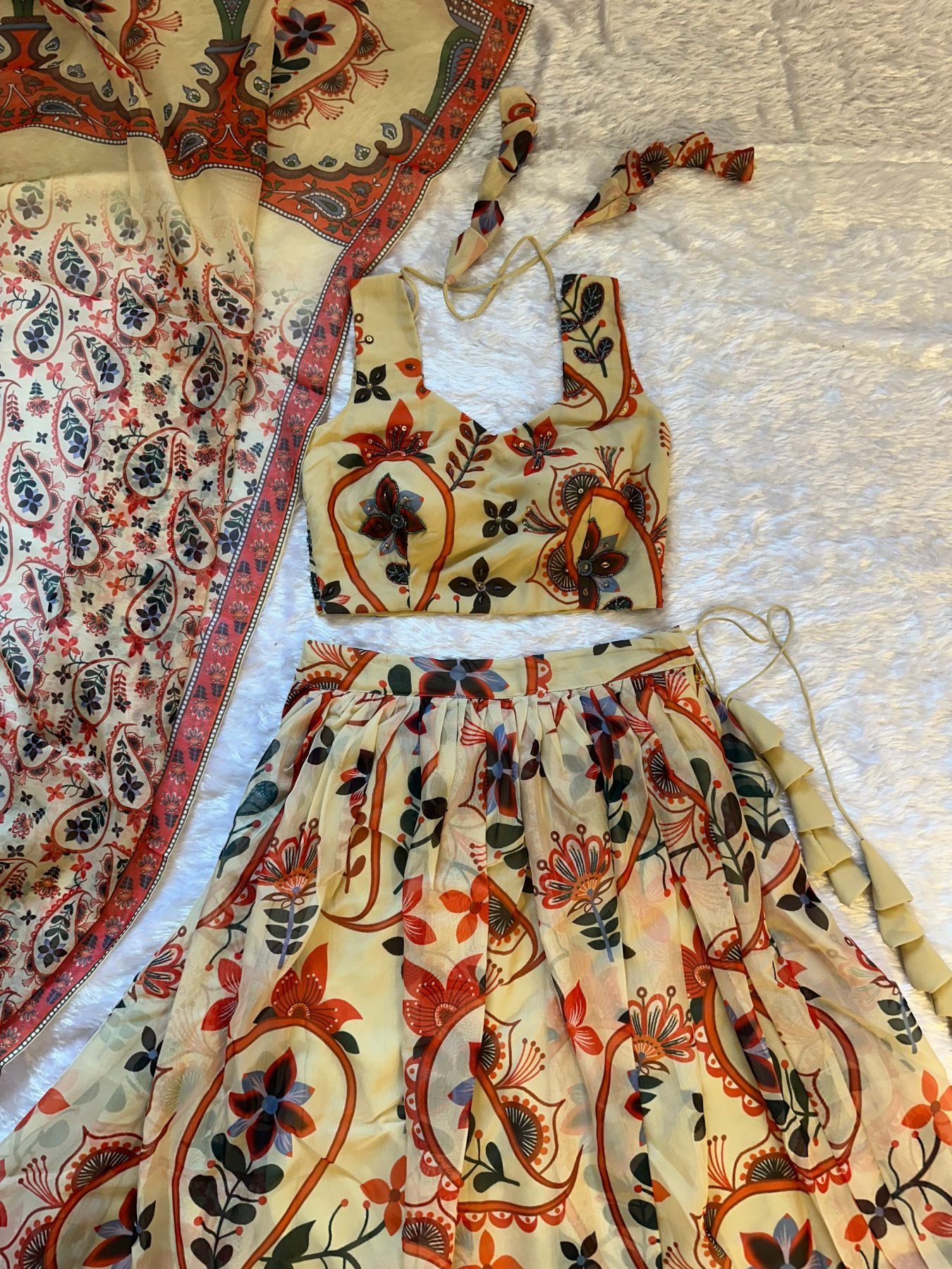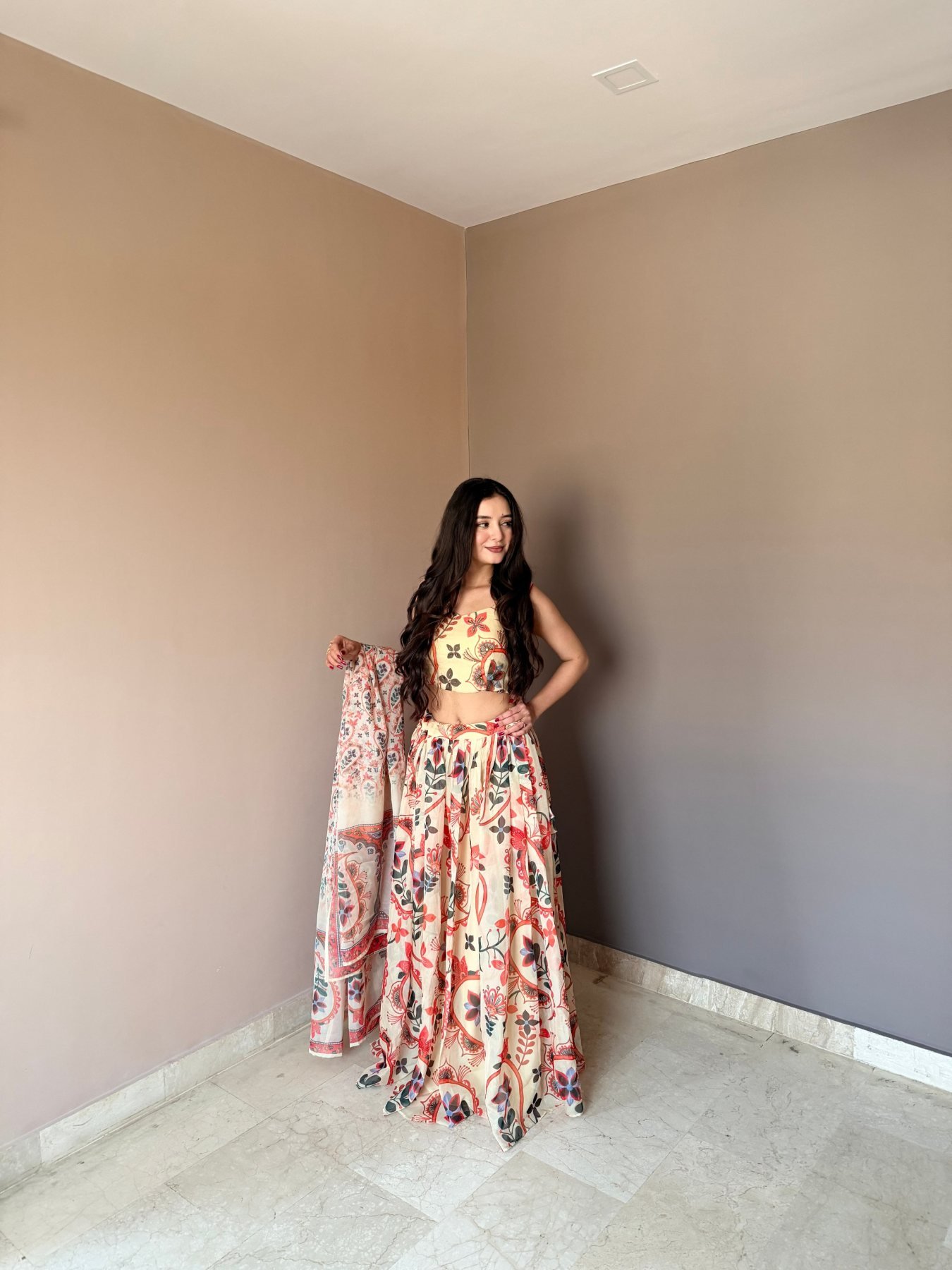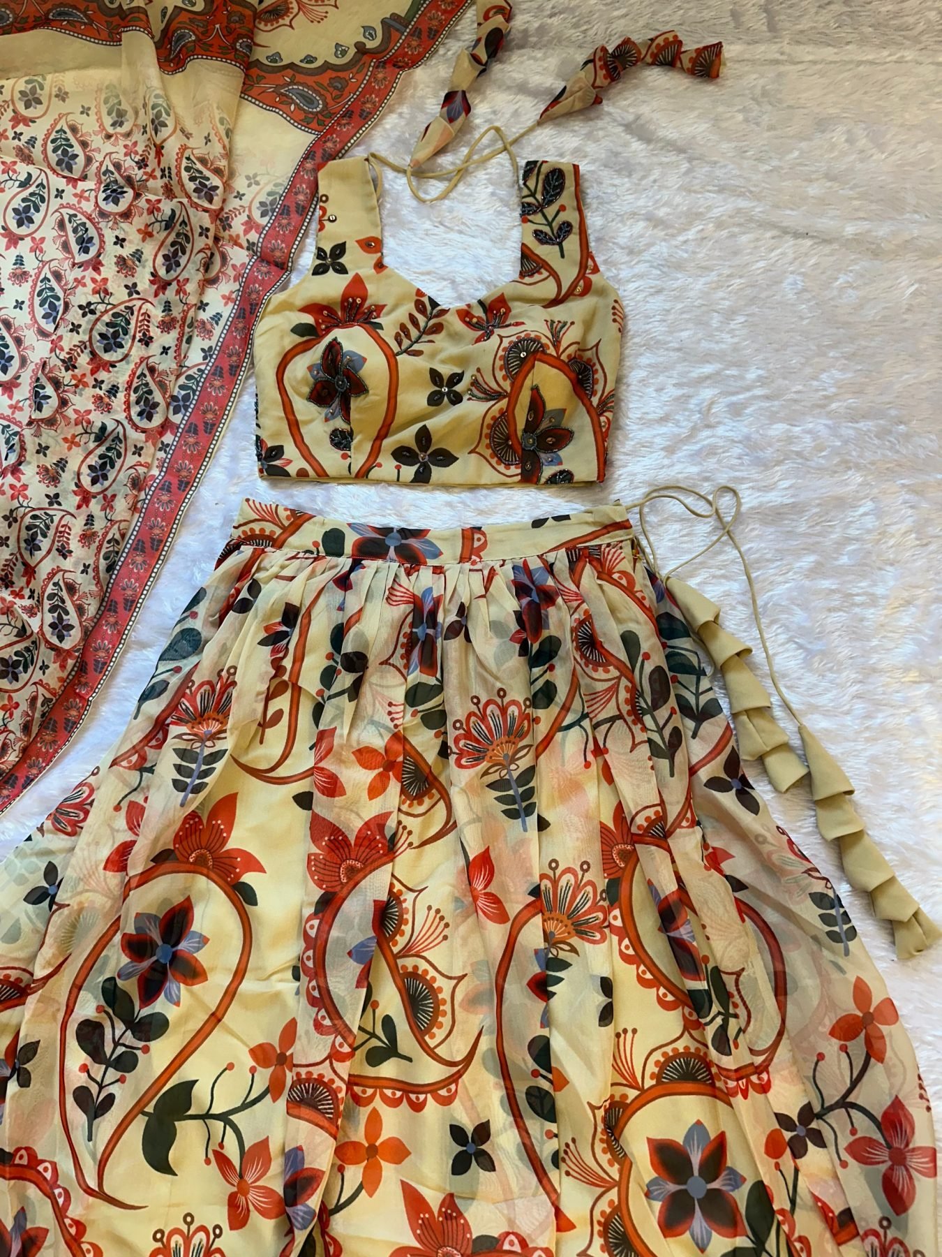 Elegant floral printed lehenga set with rich multi-panel flair, paired with stylish hand-work blouse and coordinated dupatta. Perfect for festive and party wear with graceful look.