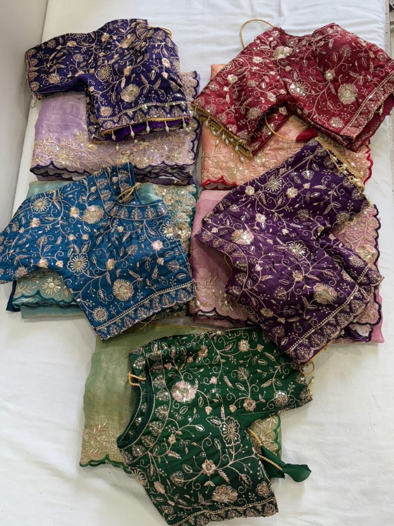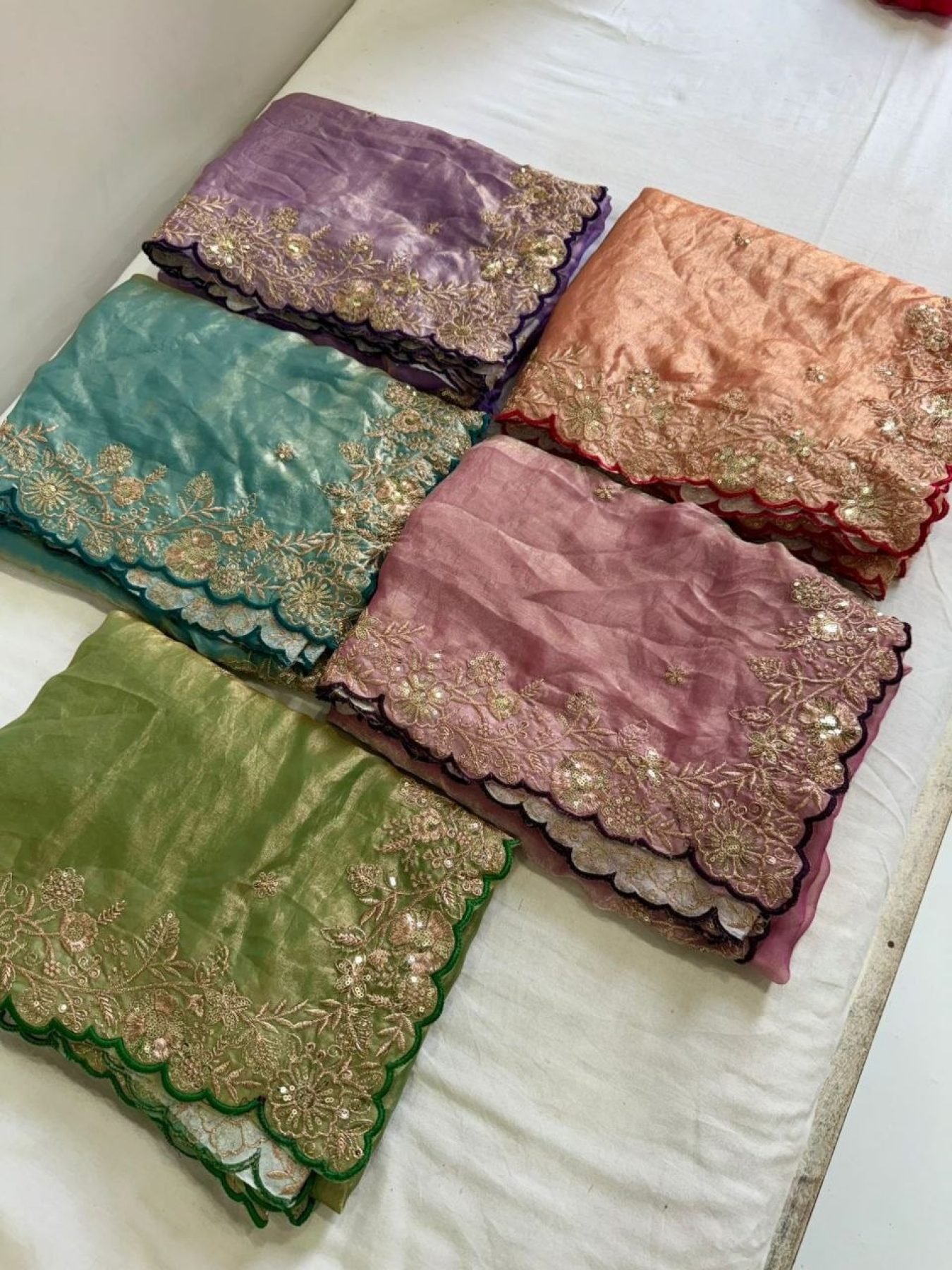 Stylish fendy satin saree featuring dual tone effect with elegant sequence work, paired with a contrast stitched blouse. Perfect for party wear, festive occasions, and special events.