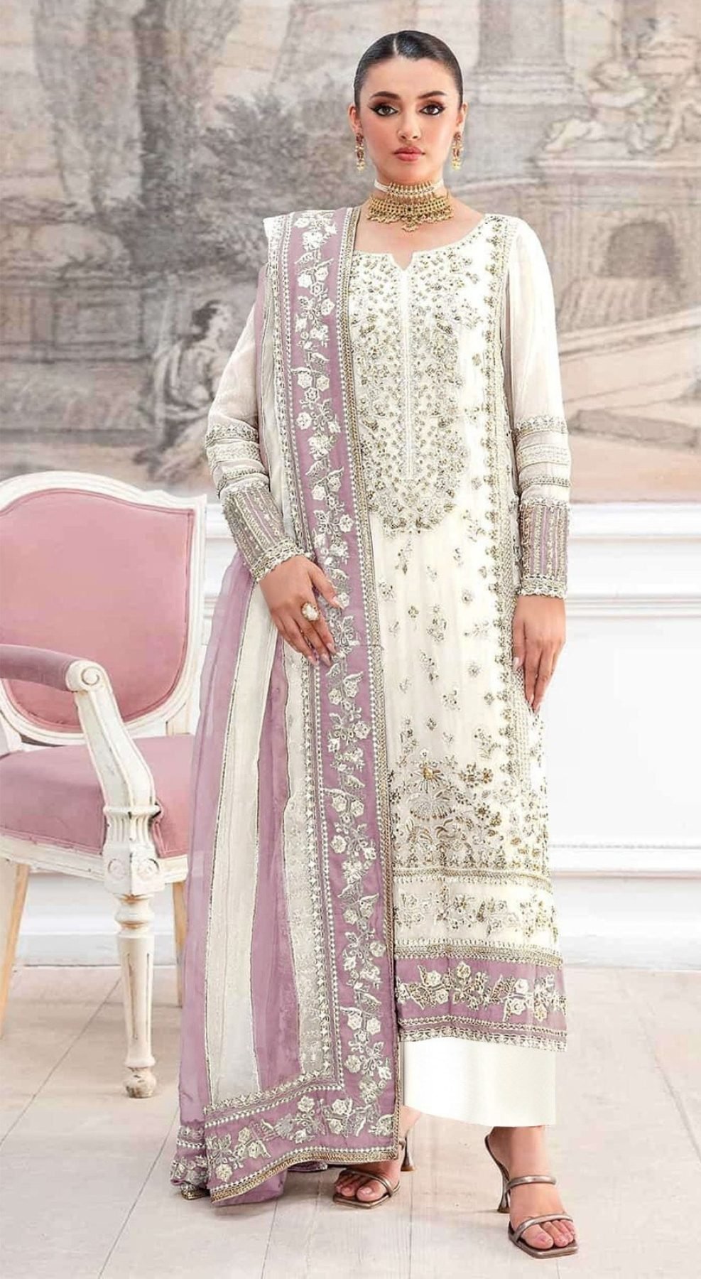 Majestic White Turquoise Embroidered Net Semi-Stitched Straight Palazzo Suit