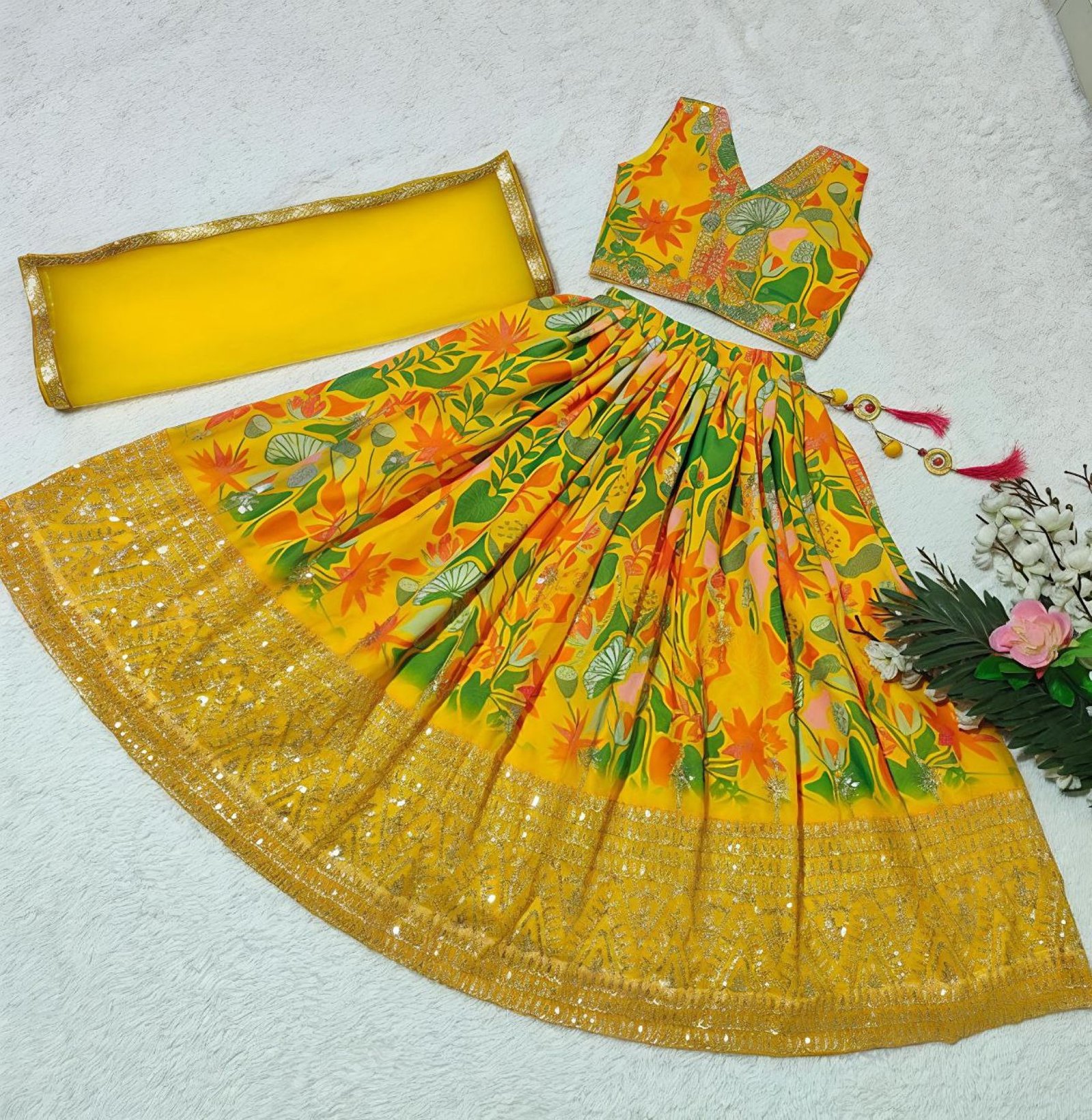 Stylish kids lehenga set crafted in faux georgette with beautiful digital print and sequins embroidery work. Paired with a matching blouse and a heavy butterfly net dupatta, perfect for festive wear and special occasions.