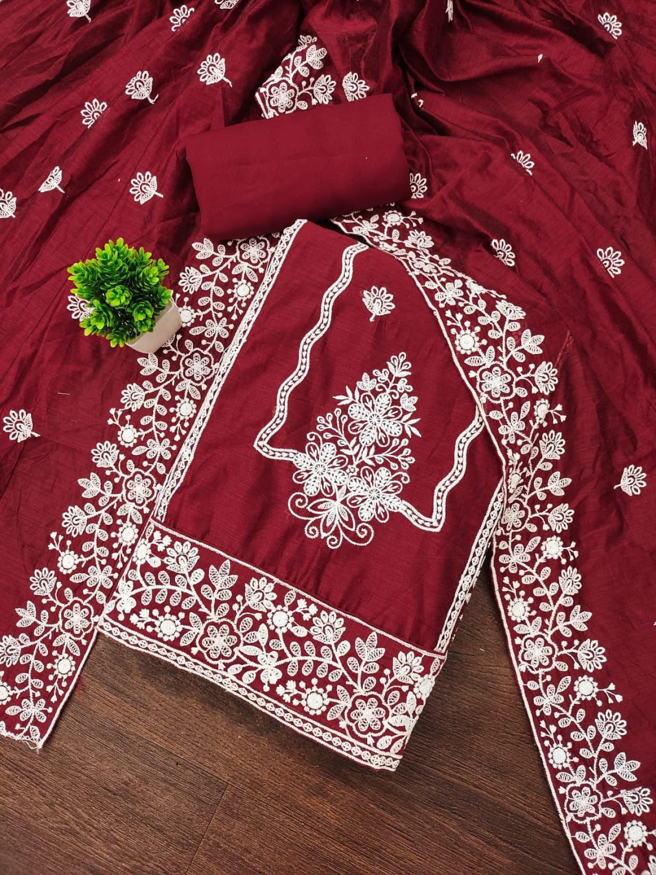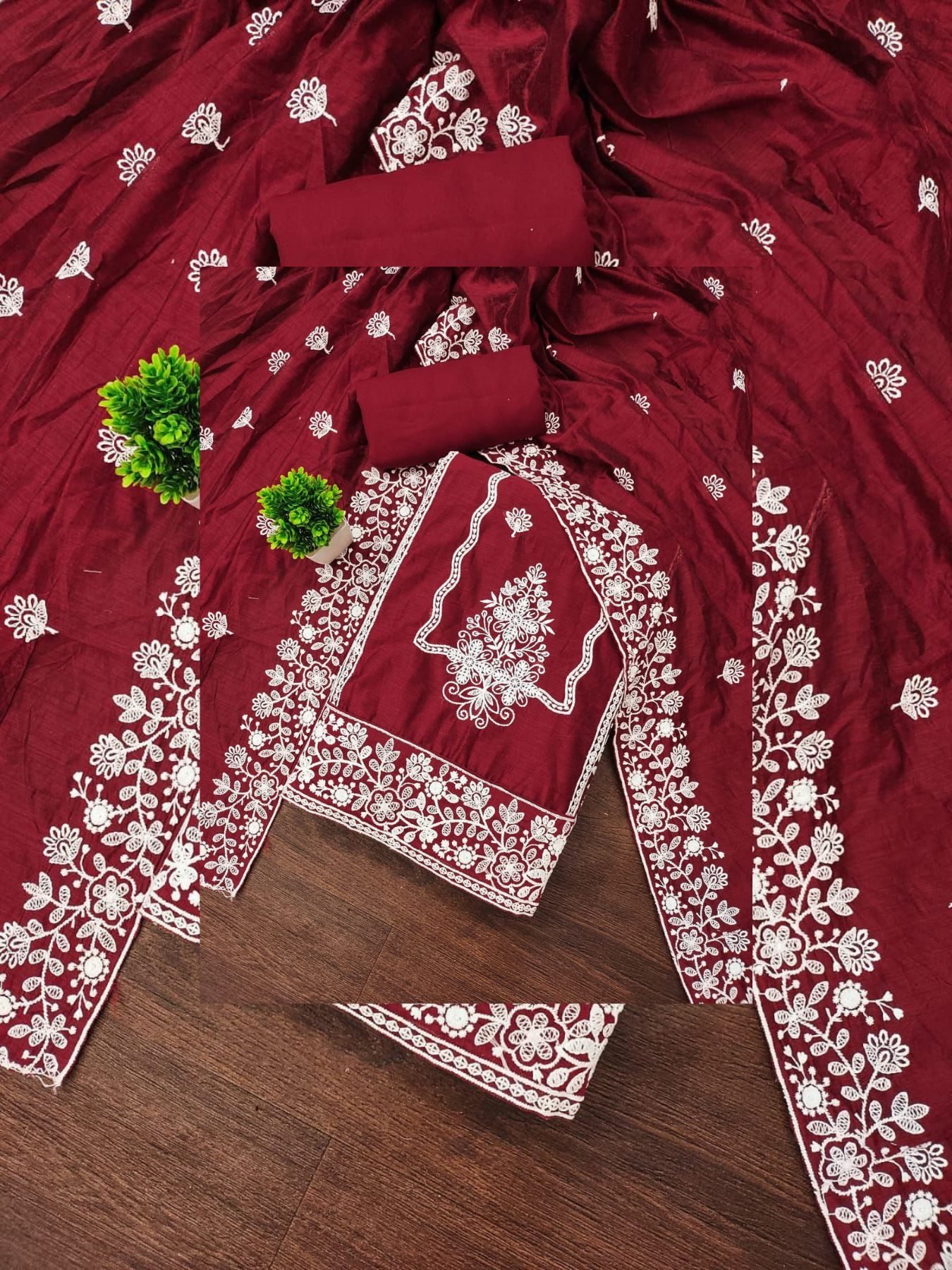 Maroon Chanderi Neck Embroidered Dress Material Set for Resellers