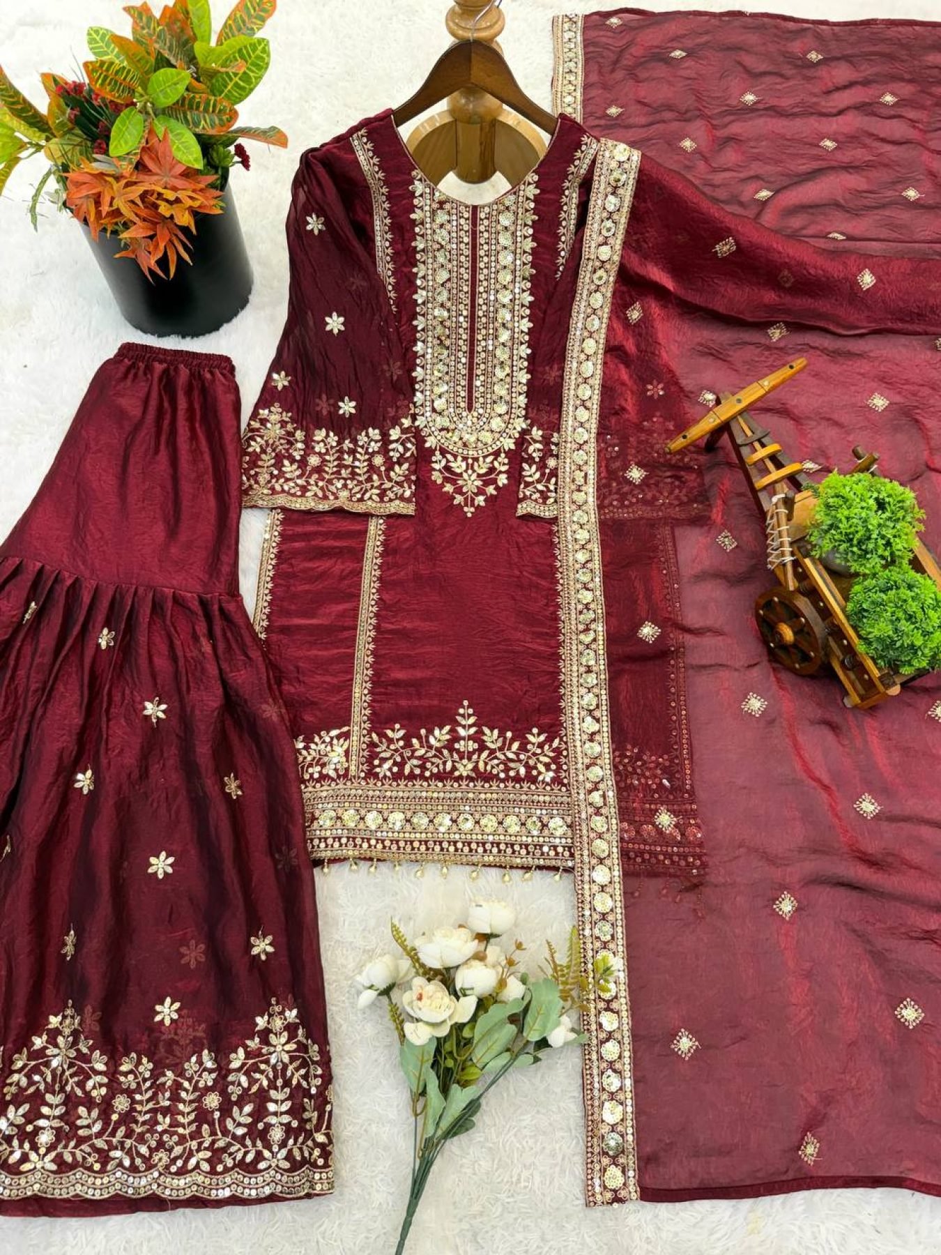 Maroon Majesty Heavy Embroidered Sharara Suit with Gold Net Dupatta