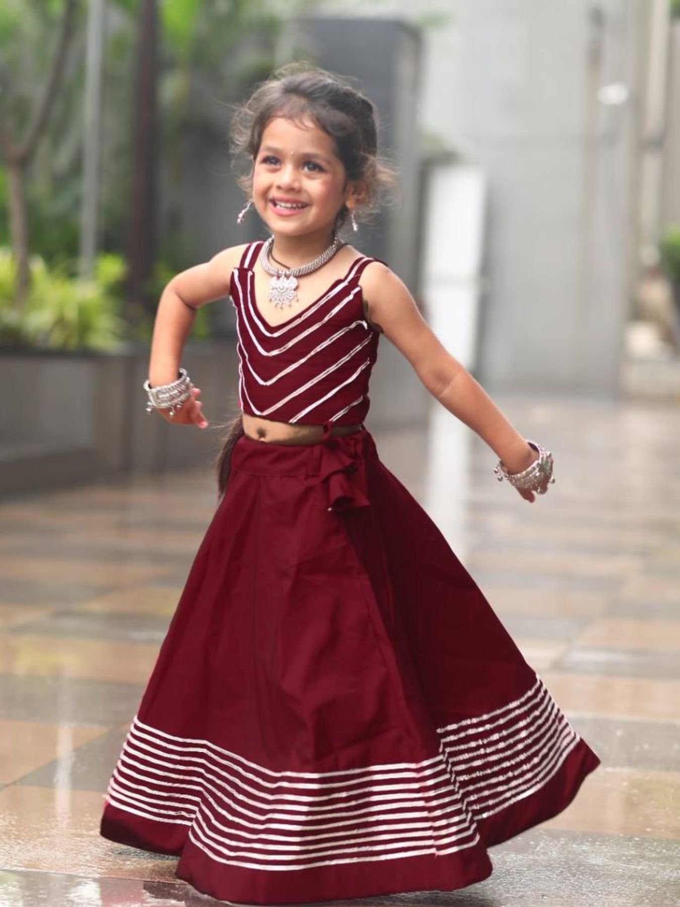 Maroon Premium Roman Silk Kids Garba Lehenga Choli Festive Celebration Wear