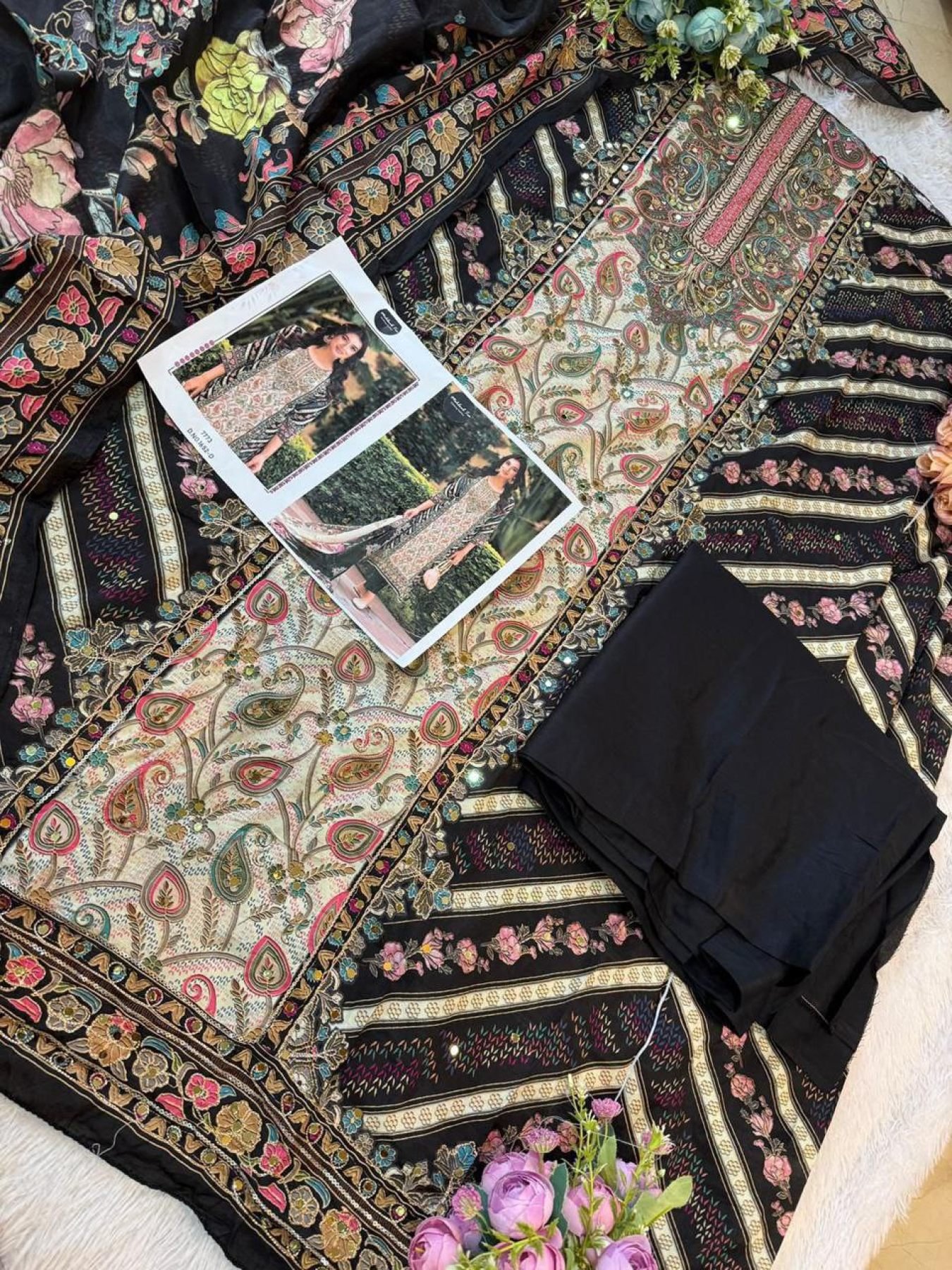 This premium suit set features a pure viscose maslin top adorned with vibrant digital prints and delicate aari handwork.
