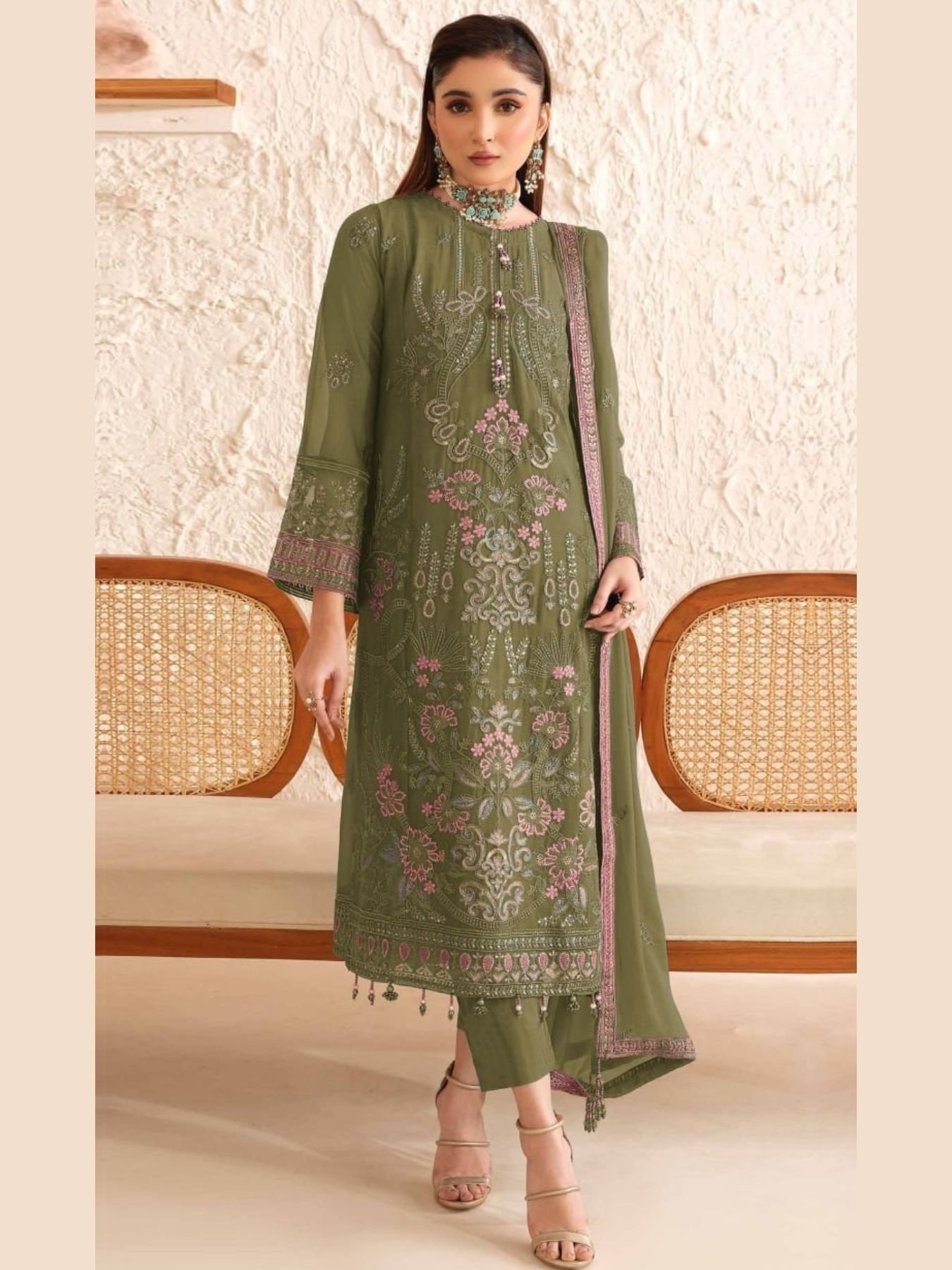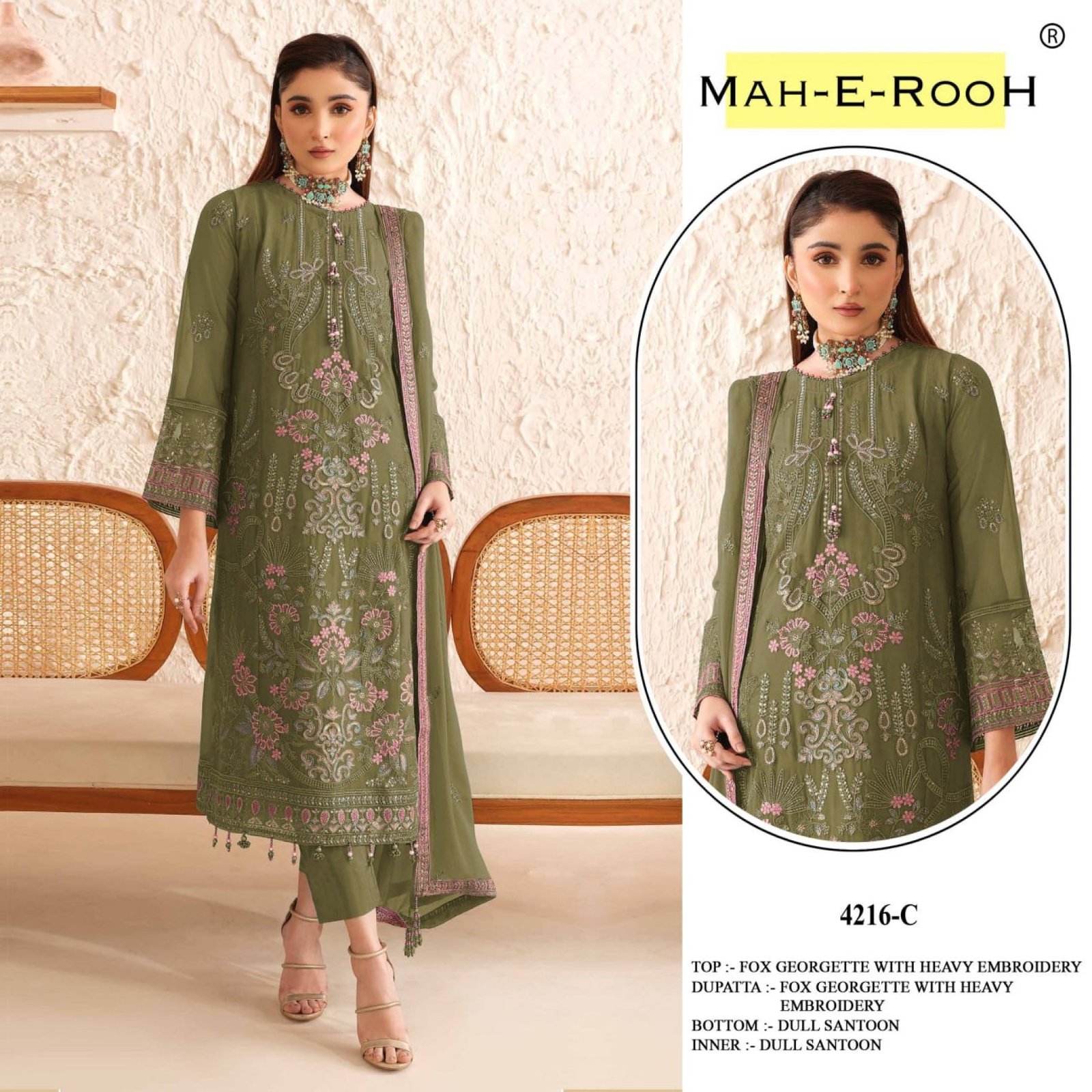 Premium Mah E Rooh designer suit crafted in heavy fox georgette with sequence embroidery and khatli work. Paired with santoon bottom and elegant dupatta, perfect for wedding, festive, and party wear with a rich ethnic appeal.