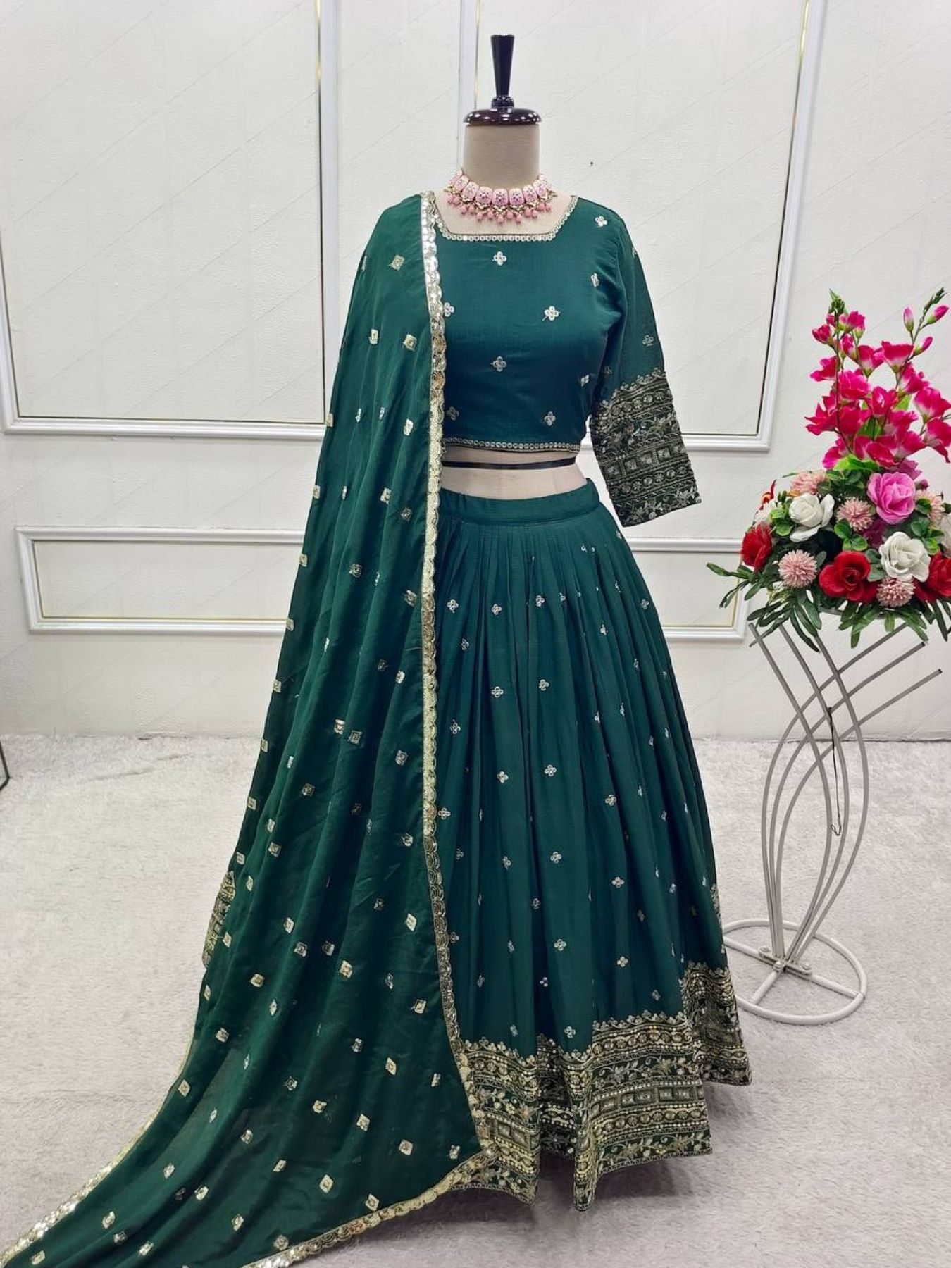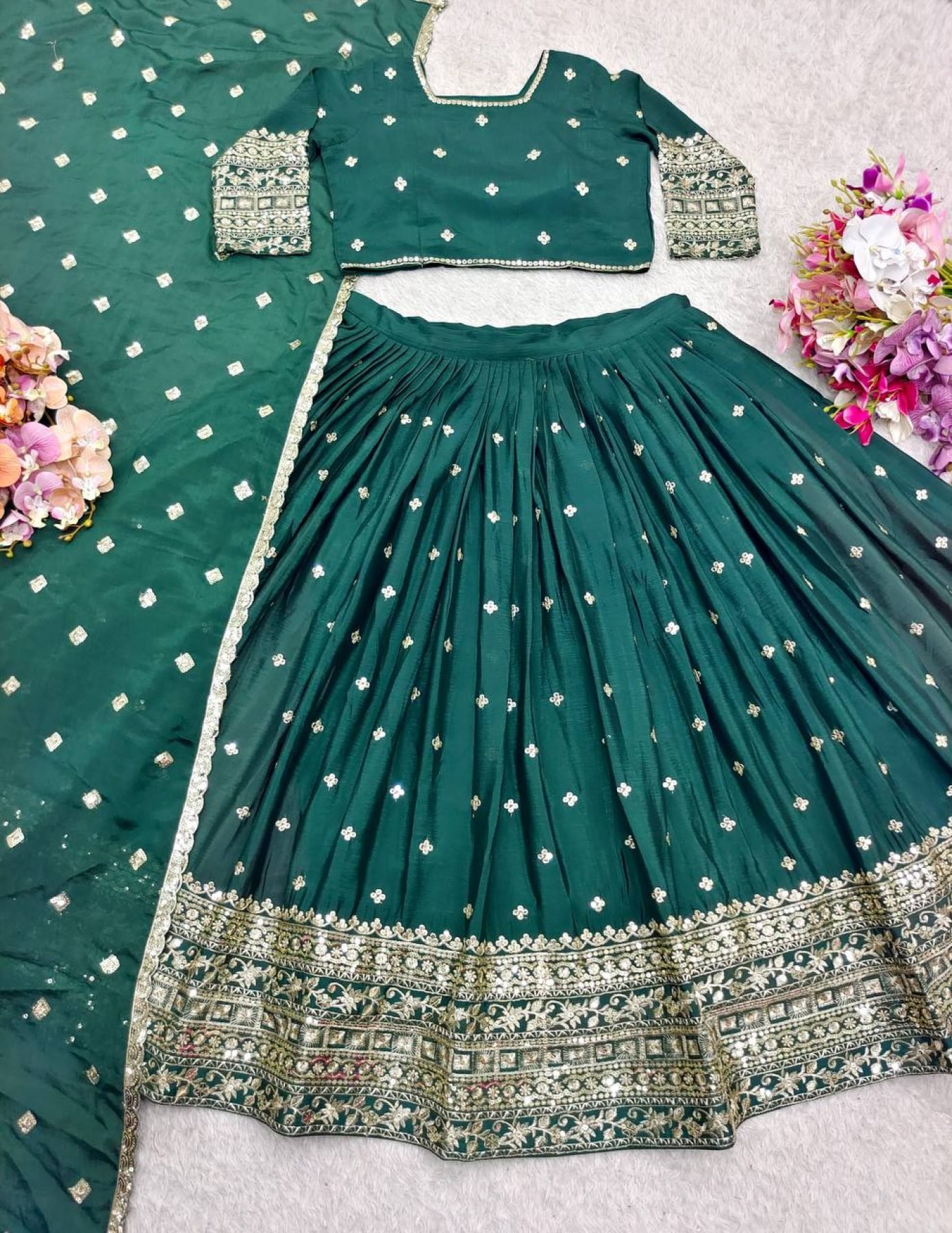 Introducing our latest Semi-Stitched Lehenga Choli Set, crafted from Pure Chinon Silk and adorned with heavy 5mm sequin embroidery work. The set includes a fully stitched dupatta, a semi-stitched lehenga with canvas patta, and an unstitched blouse piece. Ideal for weddings, parties, and festive occasions – now available at wholesale manufacturer rates.