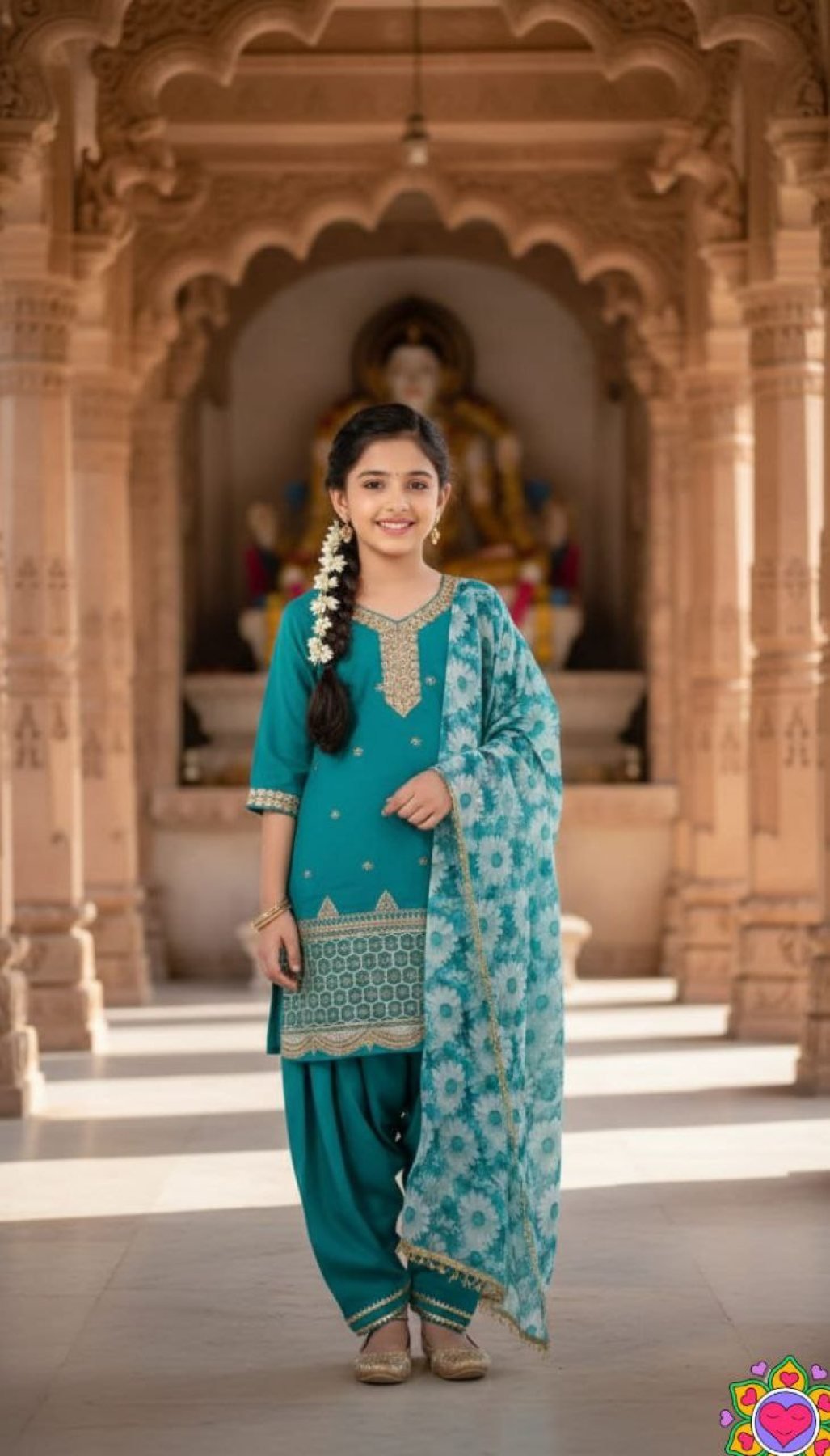Mesmerizing Teal Blue Floral Embroidered Kids Silk Crepe Suit Set with Dupatta