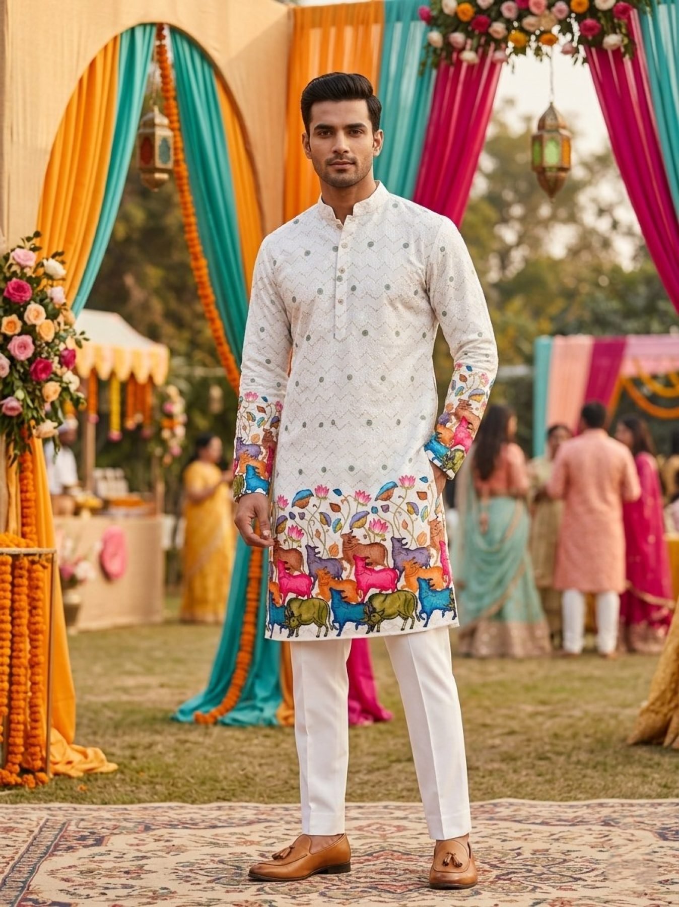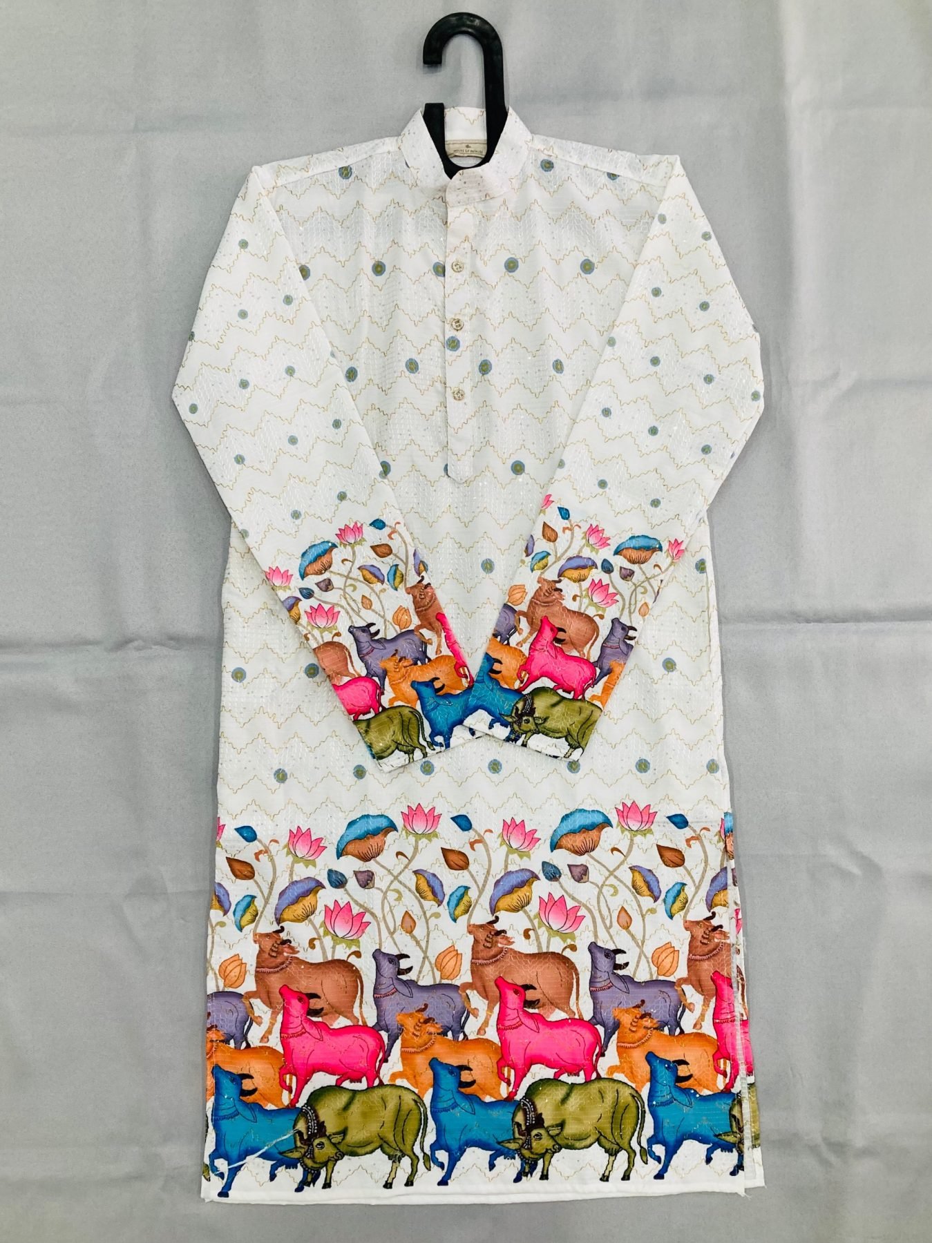 Stylish men’s cotton kurta with digital print and crochet sequins work. Available with or without pant, perfect for festive and casual traditional wear.