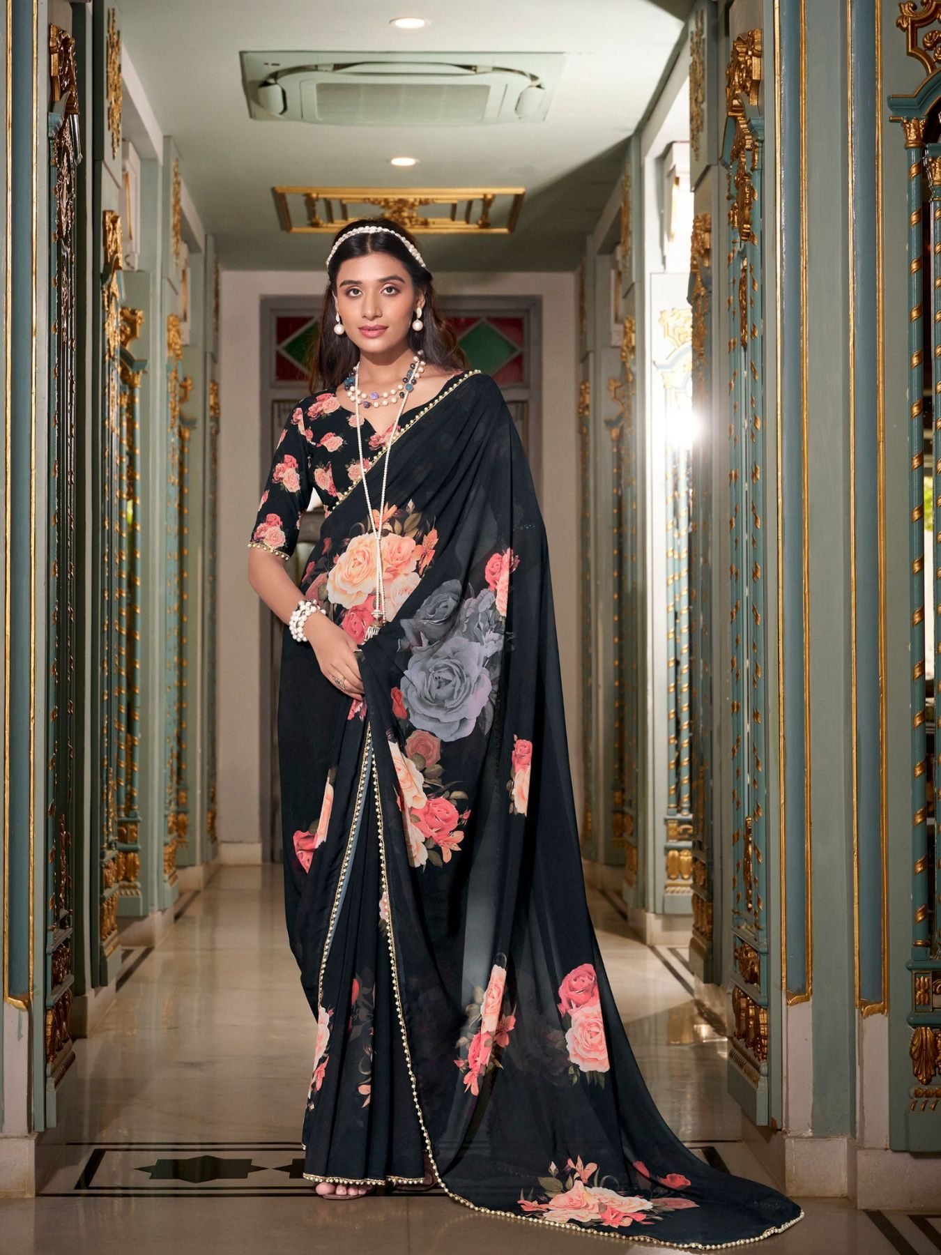 Midnight Black Georgette Saree with Rosy Floral Work Classy Evening Vibe