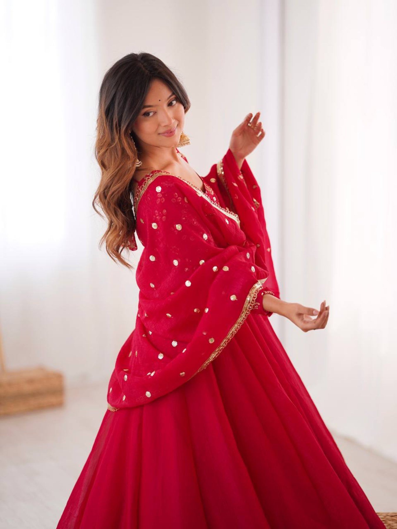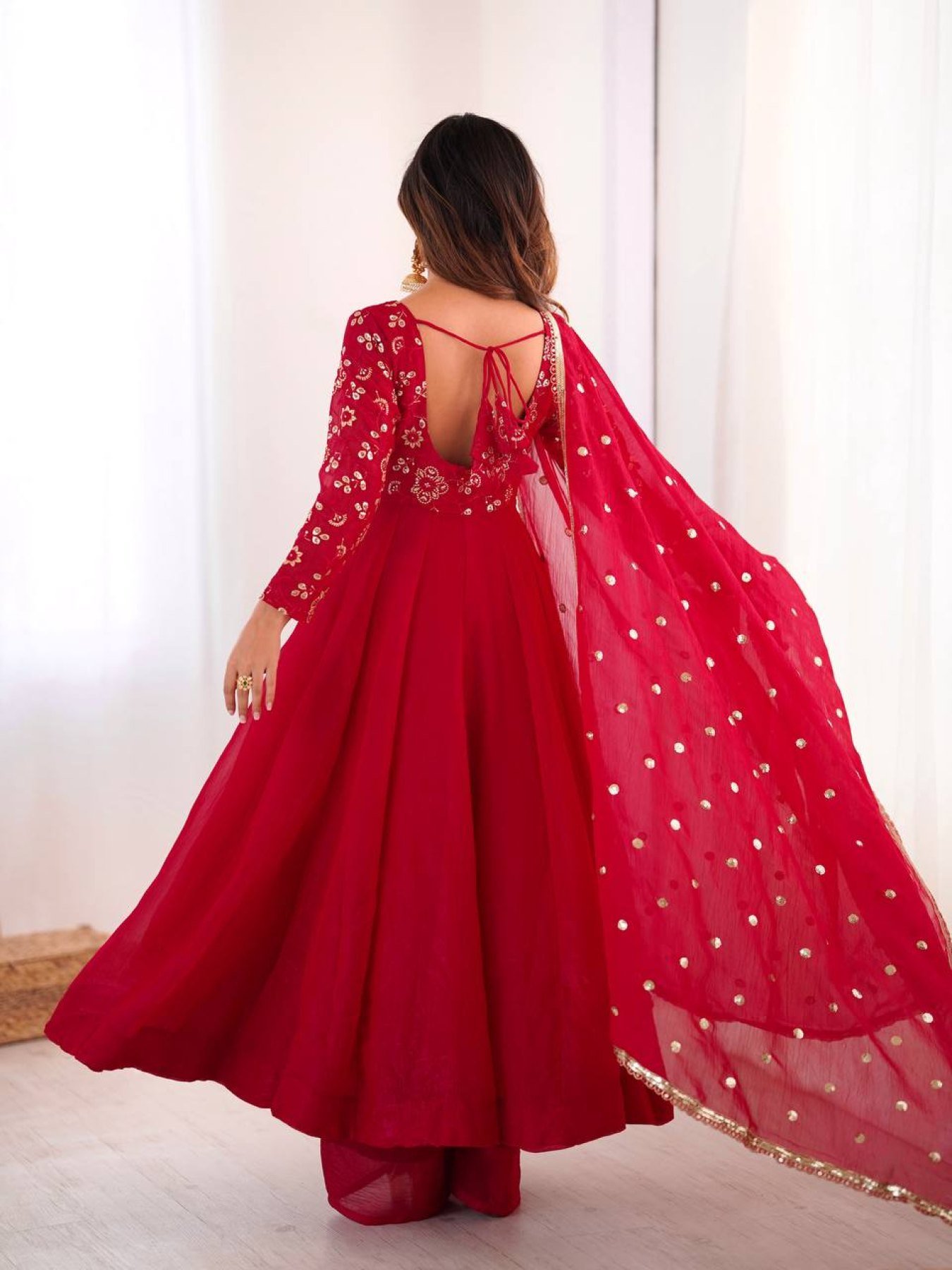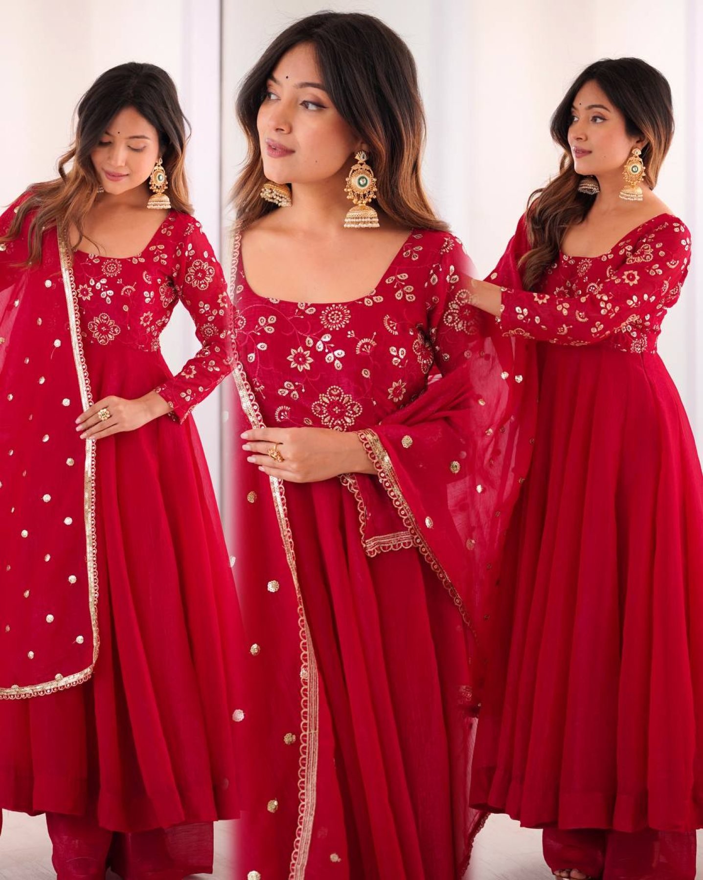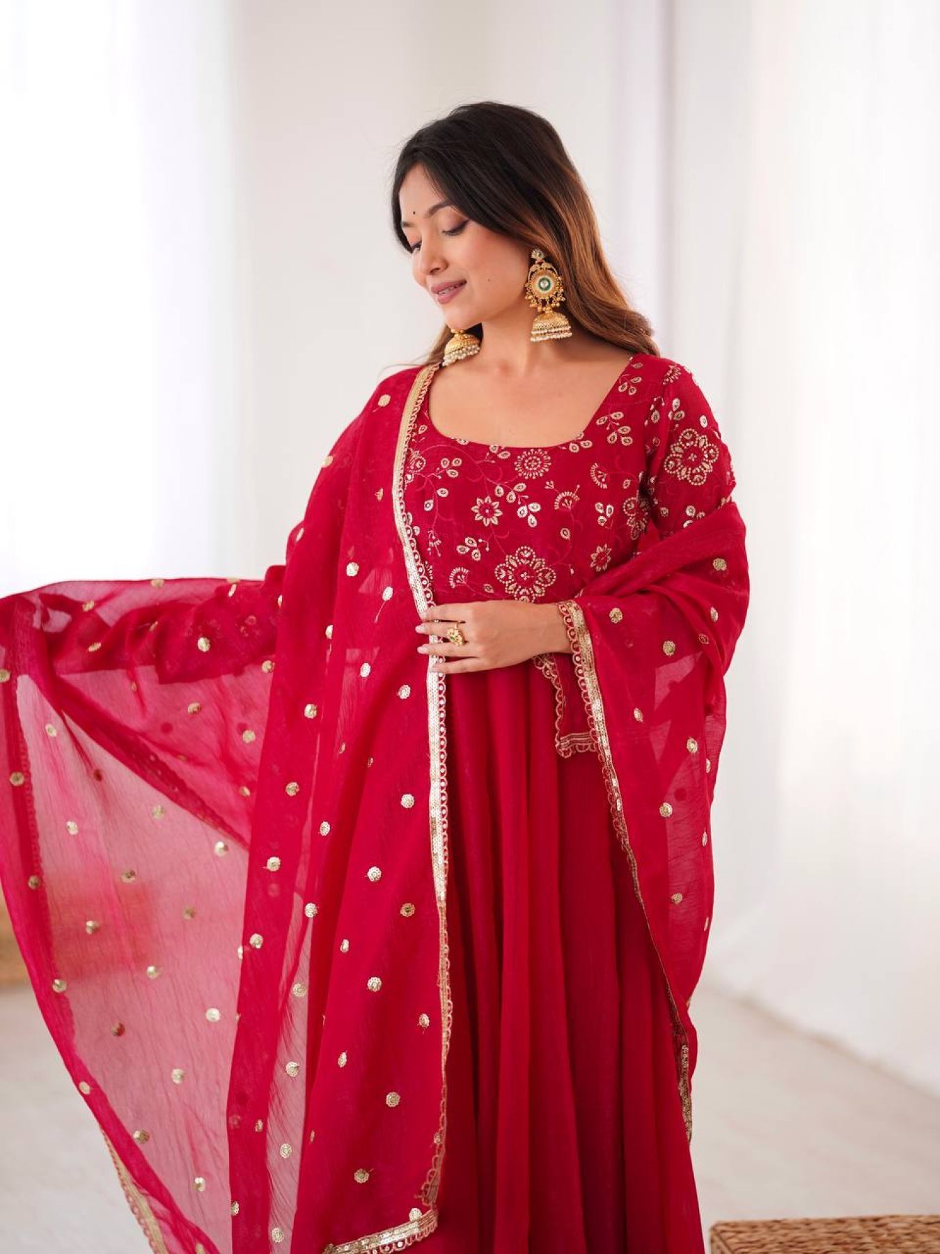 Minimalist Red Chinnon Silk Sequence Embroidery Work Readymade Kurta Set