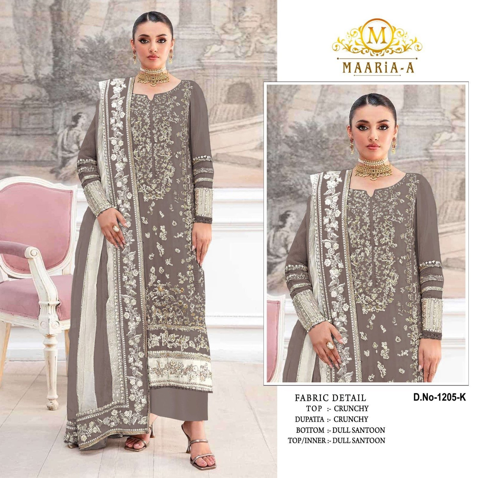 Premium crunchy fabric suit set featuring heavy embroidery sequence and khatli work, paired with santoon bottom and elegant lace dupatta. Available in material and readymade options, perfect for wedding, festive, and party wear.