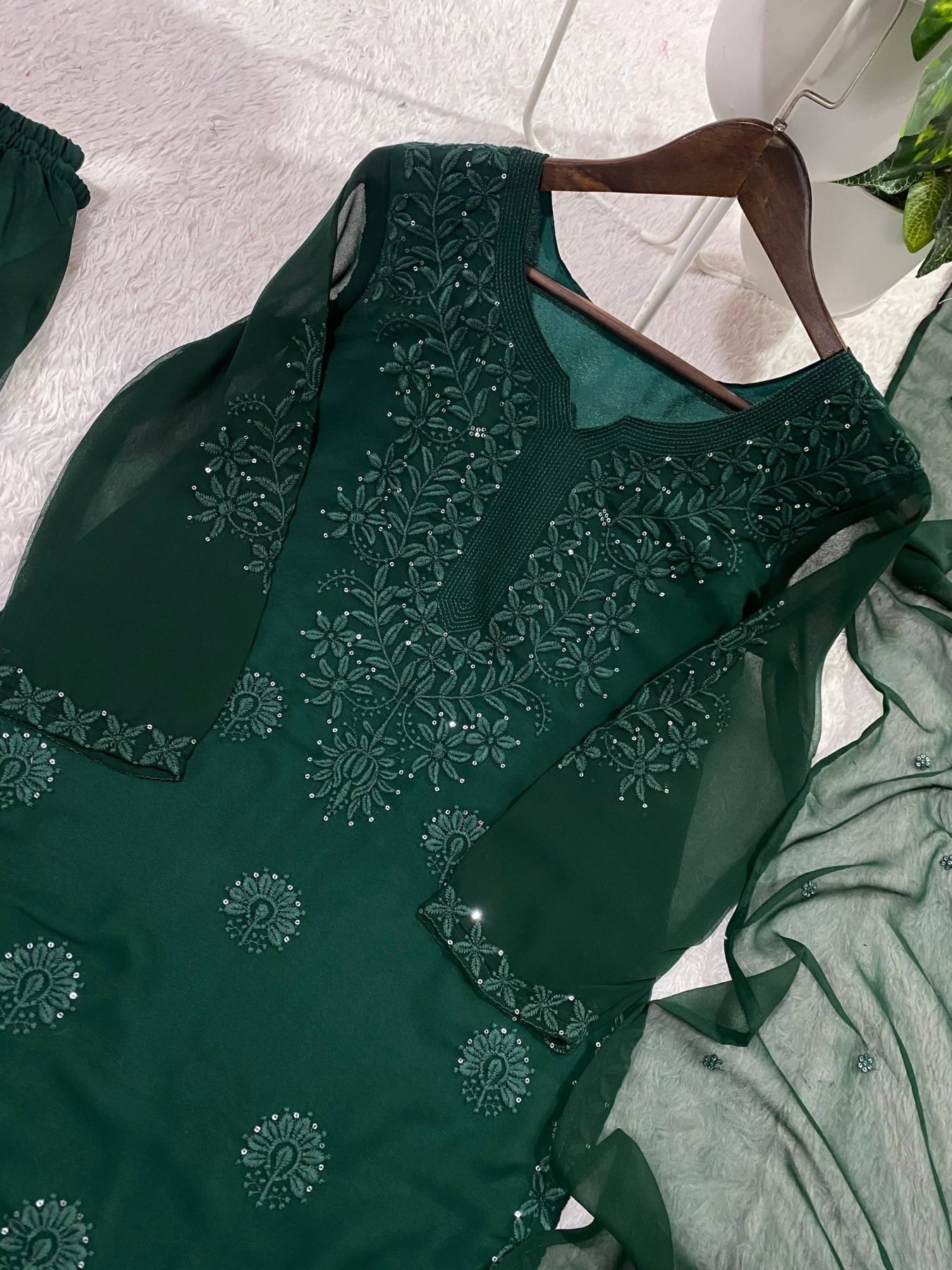 Step into a trendy and viral ethnic look with this elegant georgette sarara set featuring beautiful sequence embroidery work for a rich and graceful designer finish. Paired with a fully stitched flared sarara and a matching dupatta with lace detailing on pallu sides, this outfit offers a perfect blend of comfort and modern ethnic style, ideal for festive wear, parties, and boutique collections.