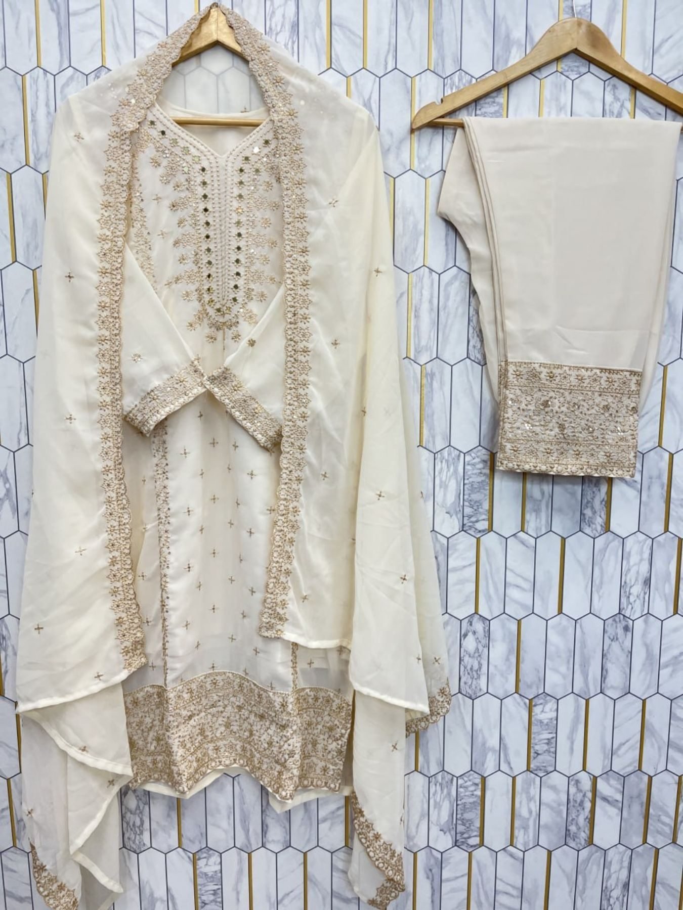 This elegant suit set is crafted from premium heavy faux georgette featuring rich embroidery and sequence work for a luxurious festive look.