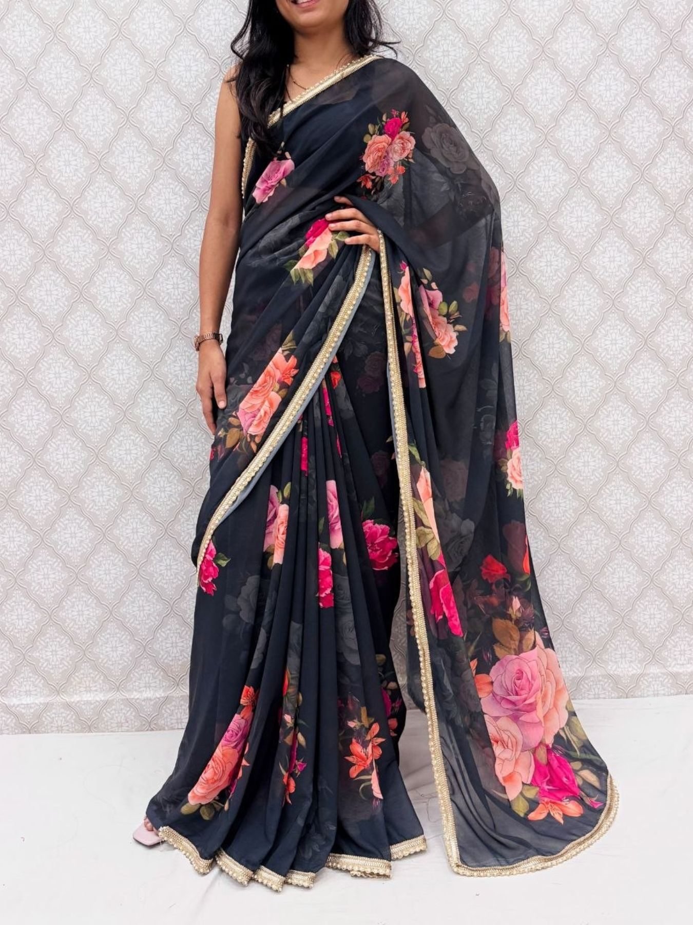 Modish Black Premium Floral Printed Saree with Elegant Border Design