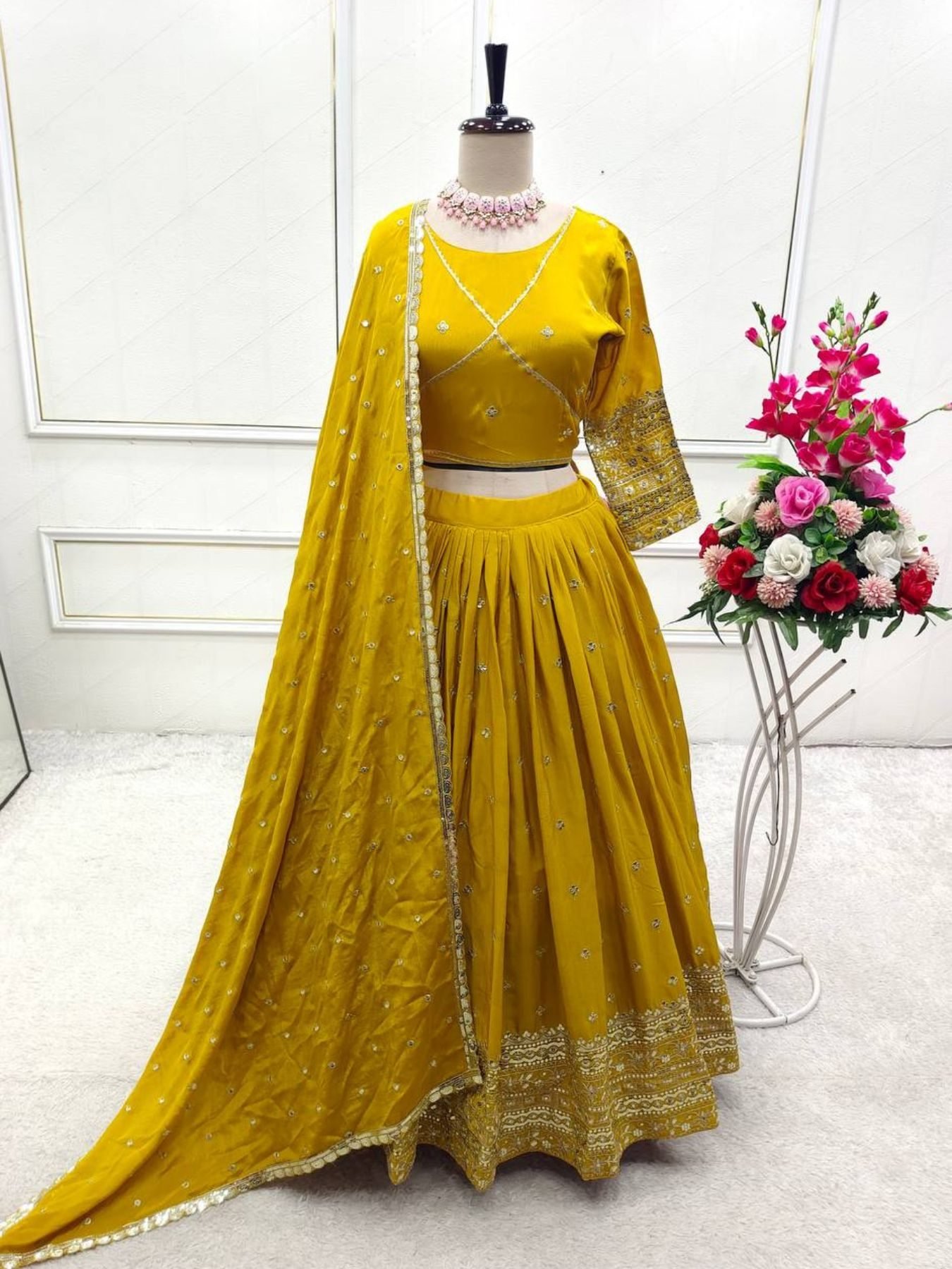 Mustard Yellow Chinon Silk Lehenga Set with Embroidery Dupatta Festive Ready Style