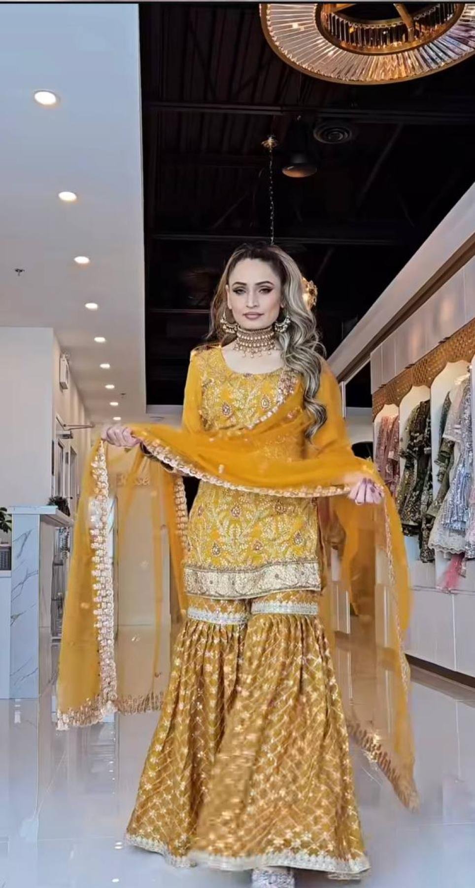 Add regal grace to your festive wardrobe with this Mustard Yellow Heavy Embroidered Sharara Suit, a stunning blend of elegance and tradition.
