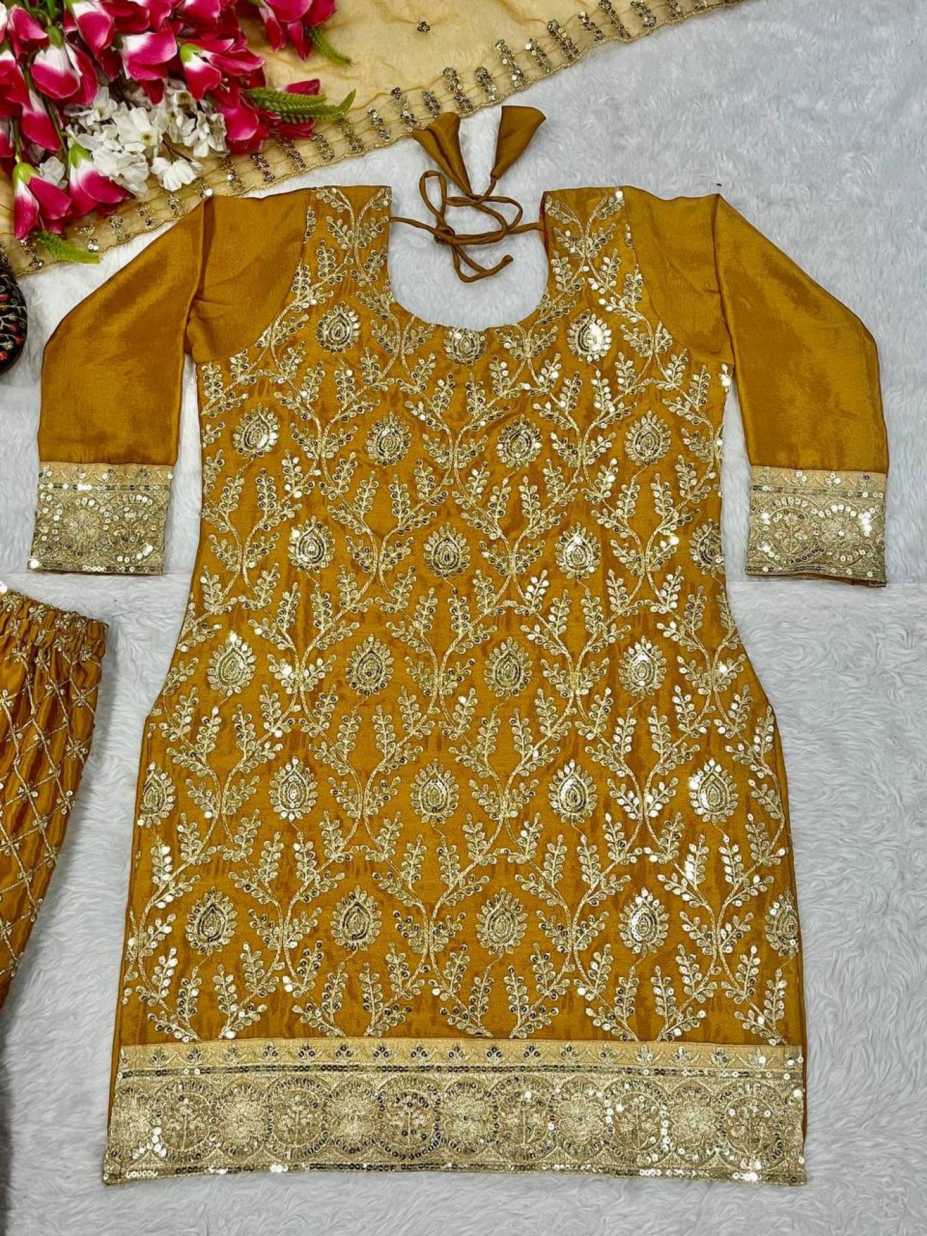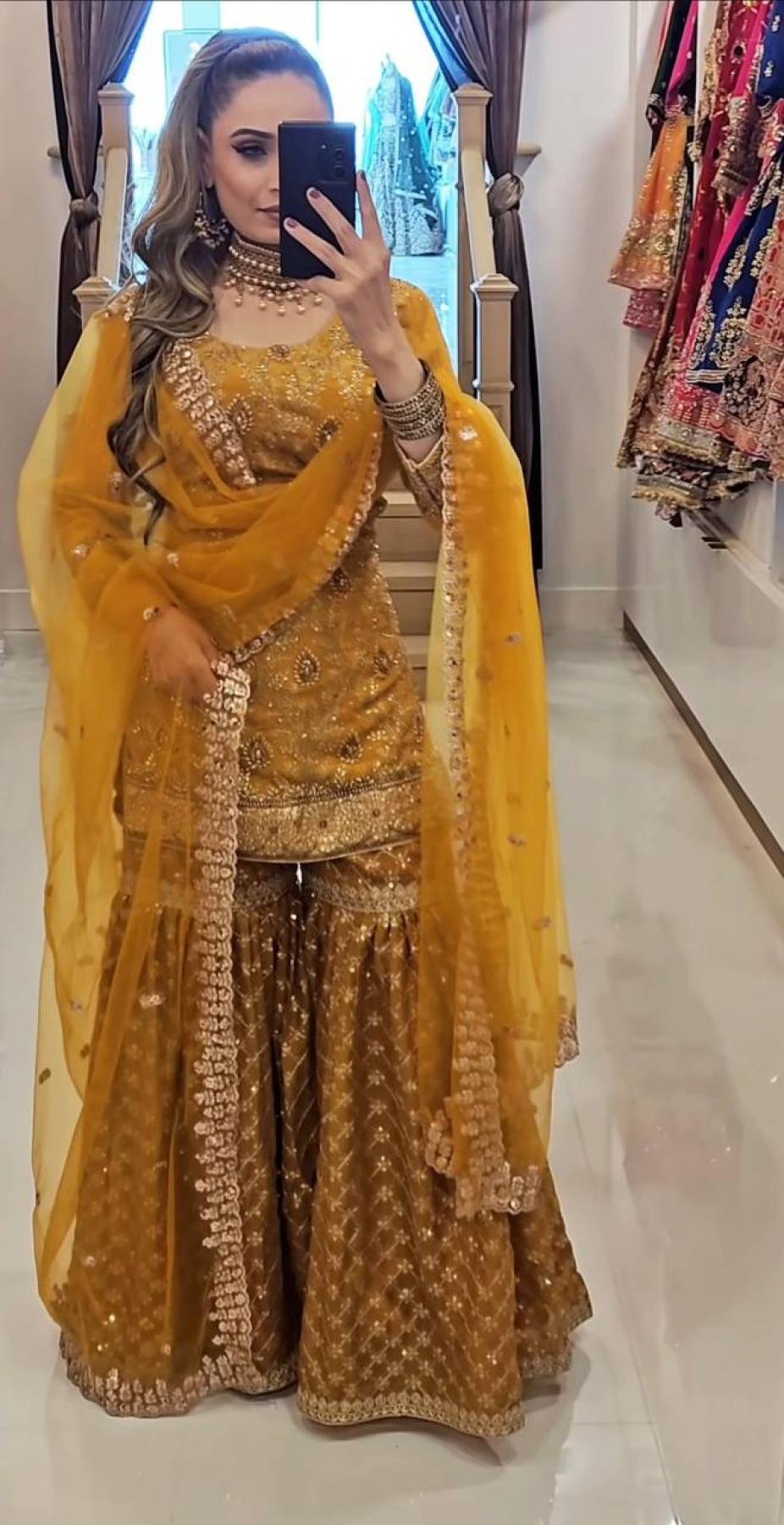 Mustard Yellow Heavy Embroidery Chinnon Silk Sharara Set With Fancy Net Dupatta