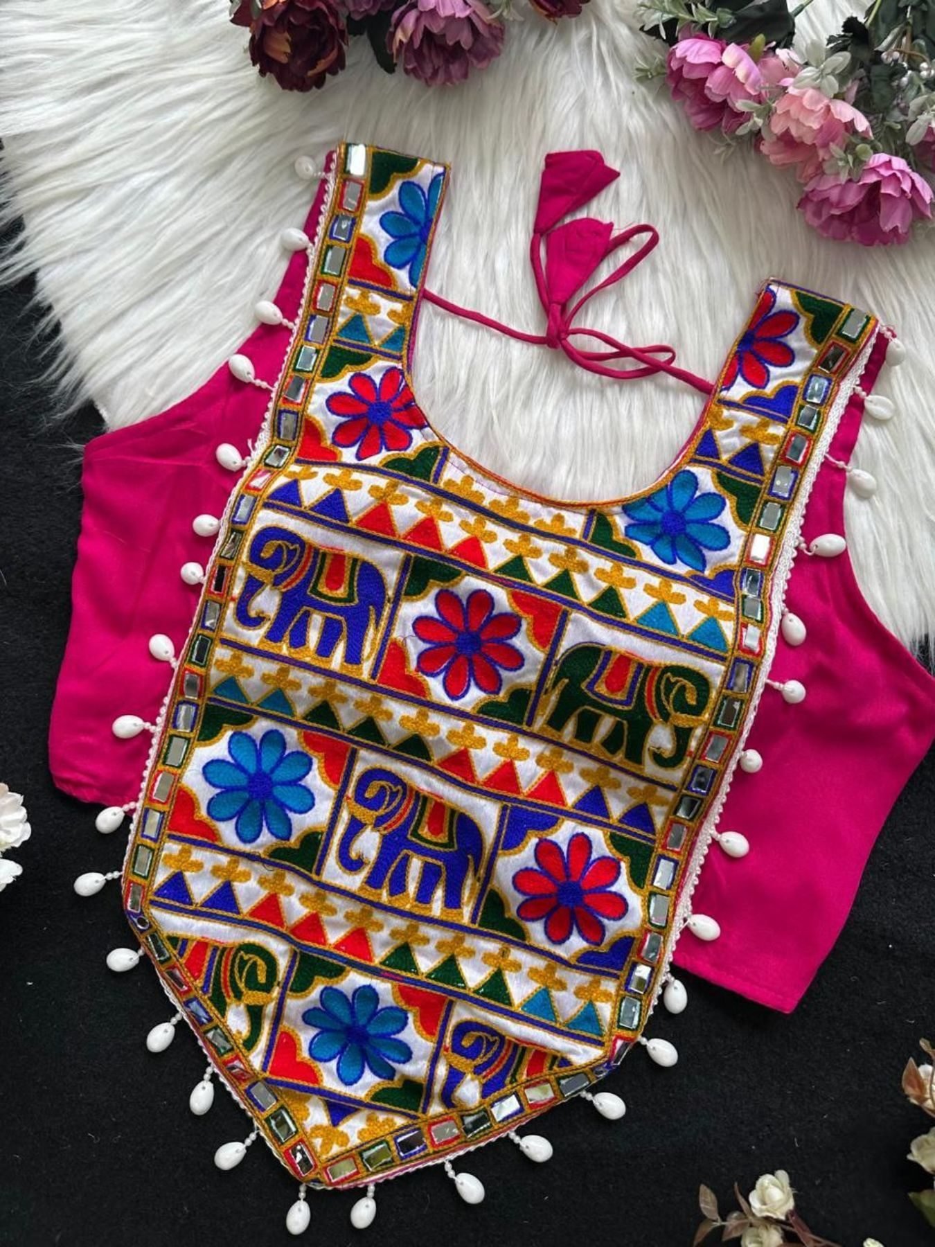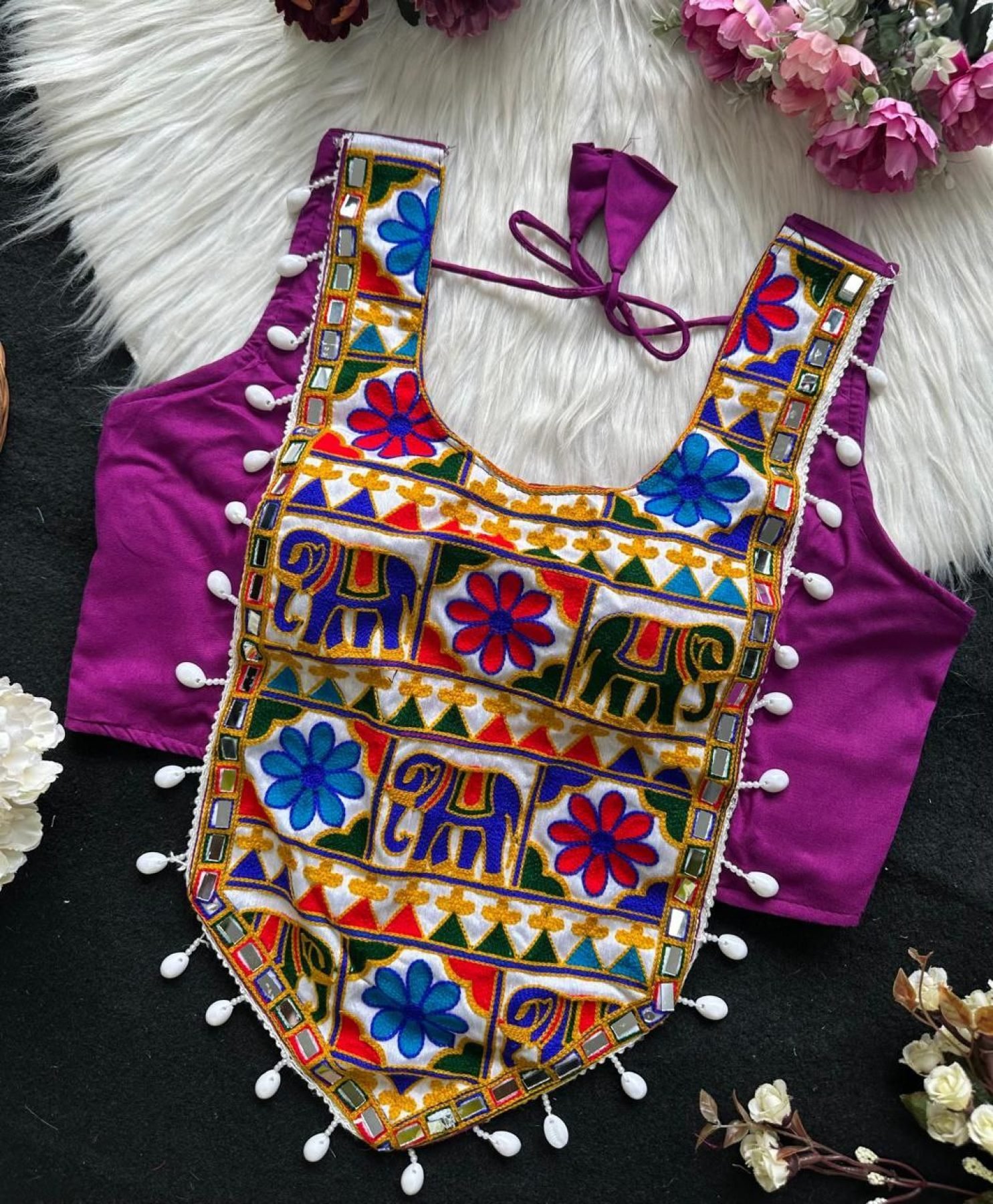 Celebrate the festive season in style with this Navratri Halter Neck Designer Blouse, beautifully crafted in pure rayon cotton. Featuring heavy codding embroidery, real shell (kaudi) lace, and handmade detailing, this blouse is the perfect choice for Garba nights, parties, and festive occasions. Designed sleeveless with a padded finish and back-open style for comfort and elegance.