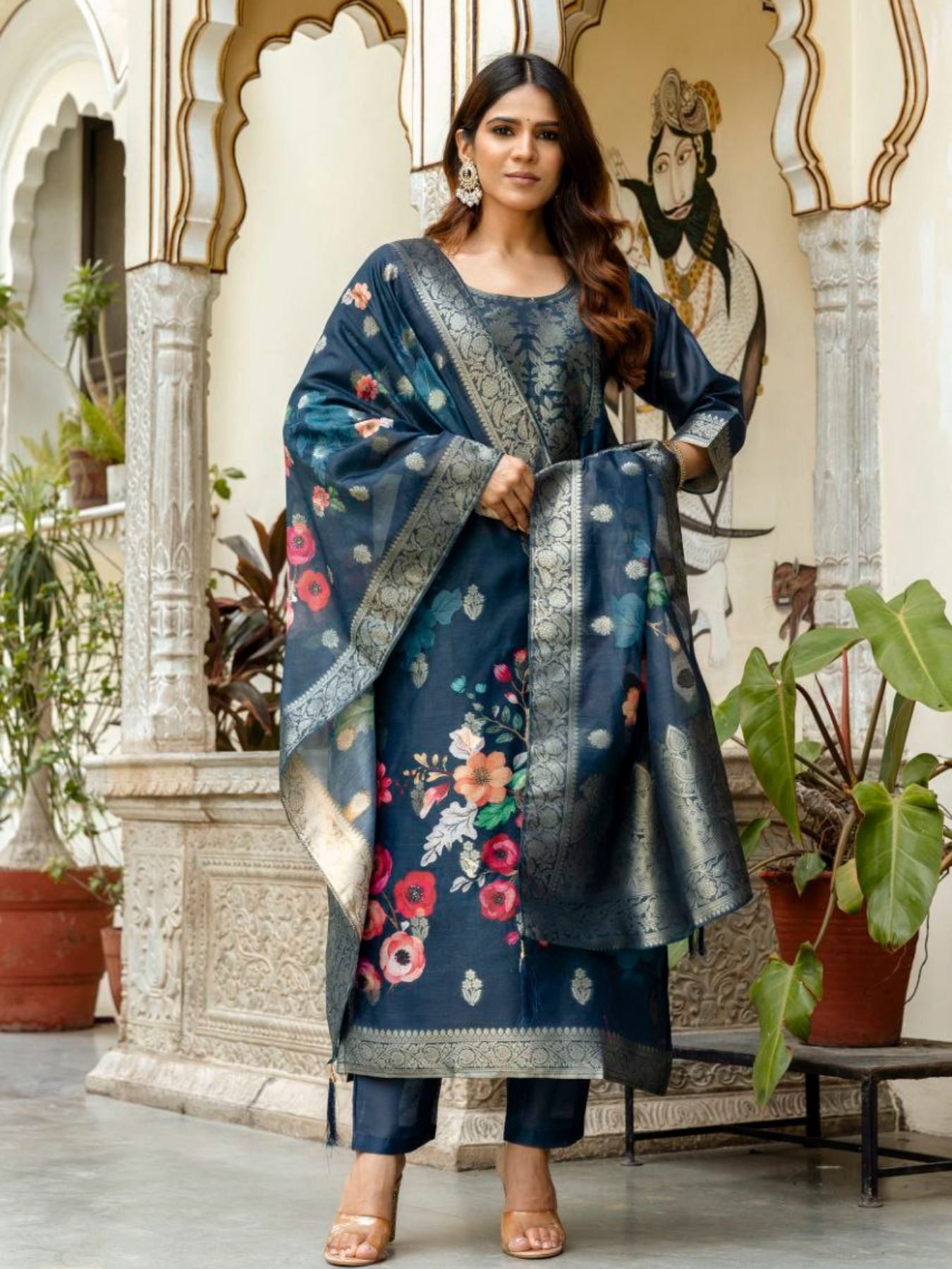 Navy Blue Viscose Chanderi Silk Suit with Zari Weaving and Dupatta Perfect for Festive Wear