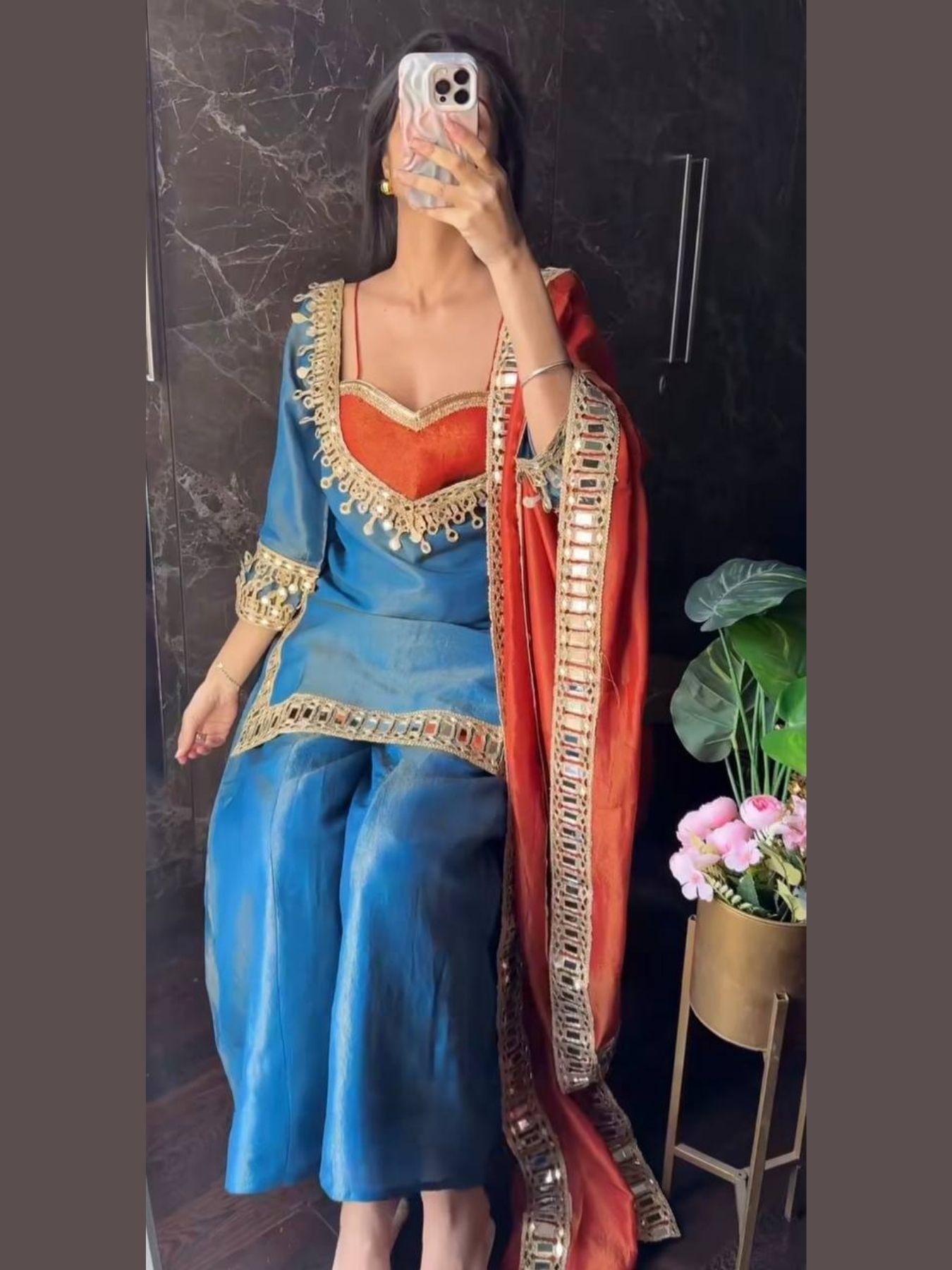 Step into the season of celebrations with this stunning Chinon Bustier Plazo Set with Dupatta, designed to reflect luxury and elegance. Made from premium Chinon fabric and lined with soft Crape material for comfort, this ensemble features a padded bustier with side zip, flared plazo, and lightweight dupatta — all beautifully adorned with thread embroidery, zari detailing, real mirror work, and lace accents. Perfect for festive gatherings, parties, and wedding functions, this outfit ensures you walk with your own shine.