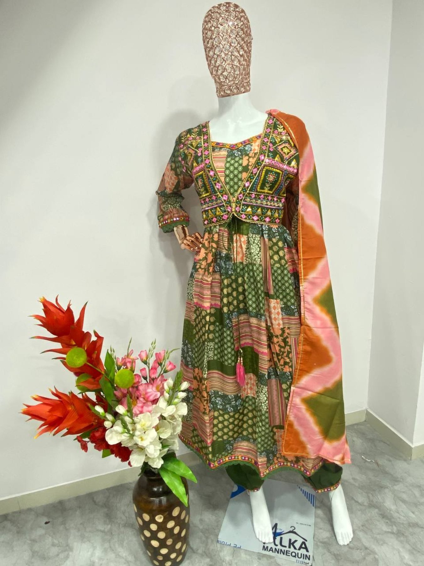 New Collection Elegant Maslin Silk Aliya Cut Gown Set with Multicolour Embroidery Lace Detailing