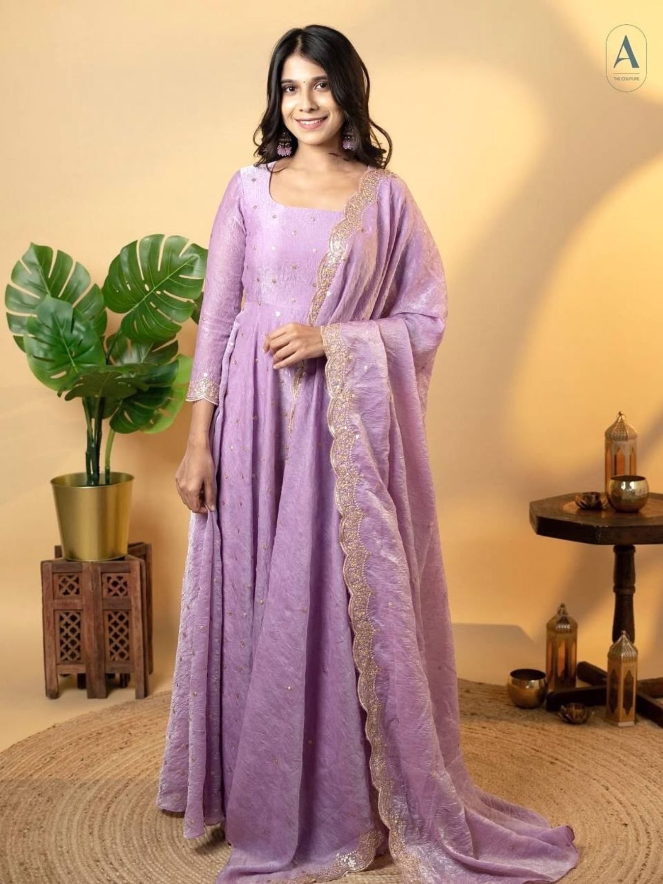 Size ChartUpgrade your ethnic wardrobe with this exquisite umbrella gown set, crafted from premium Pur Soft Gold Crush Silk and adorned with intricate embroidery and 5mm sequence work. This fully stitched ensemble offers a luxurious feel and a flattering fit, making it perfect for festive occasions, weddings, and special events.
