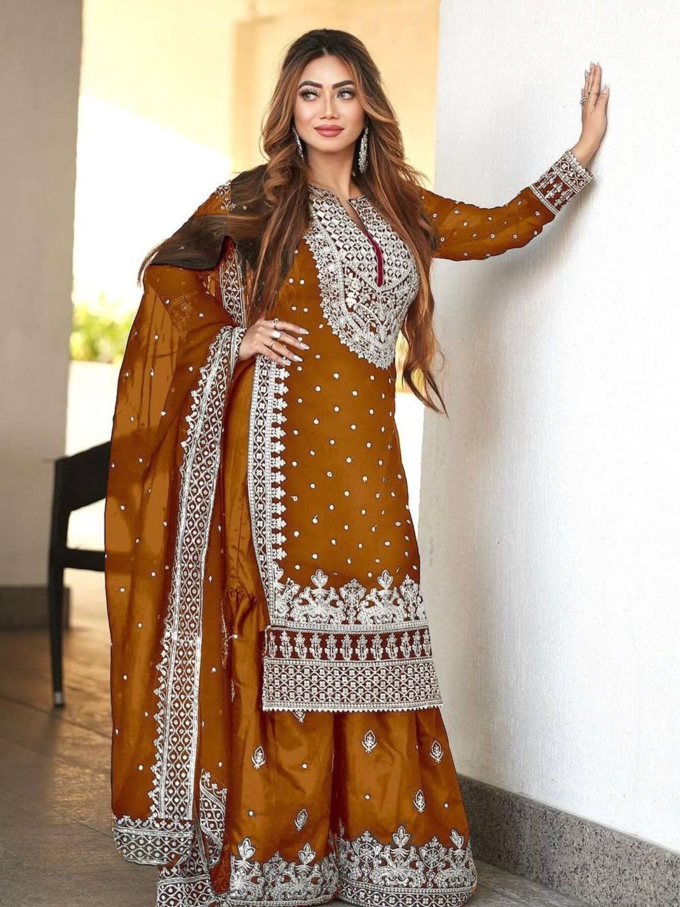 Embrace elegance with this stunning Faux Georgette Gharara Set. Featuring intricate embroidery sequence work and a luxurious feel, this set is perfect for weddings, festive occasions, or any special celebration.