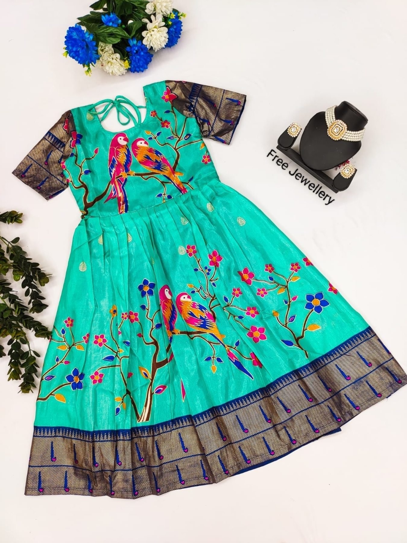 Size ChartNew Launching Top Selling Zari Foil Work Parrot Stitched Gown & Dupatta with Free Jewellery For Marriage/ Festive Season