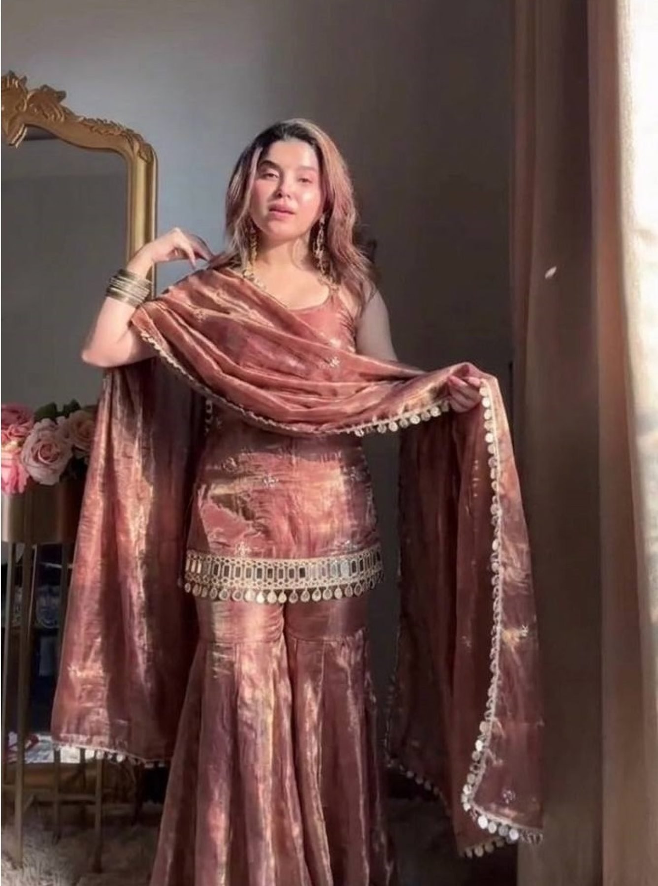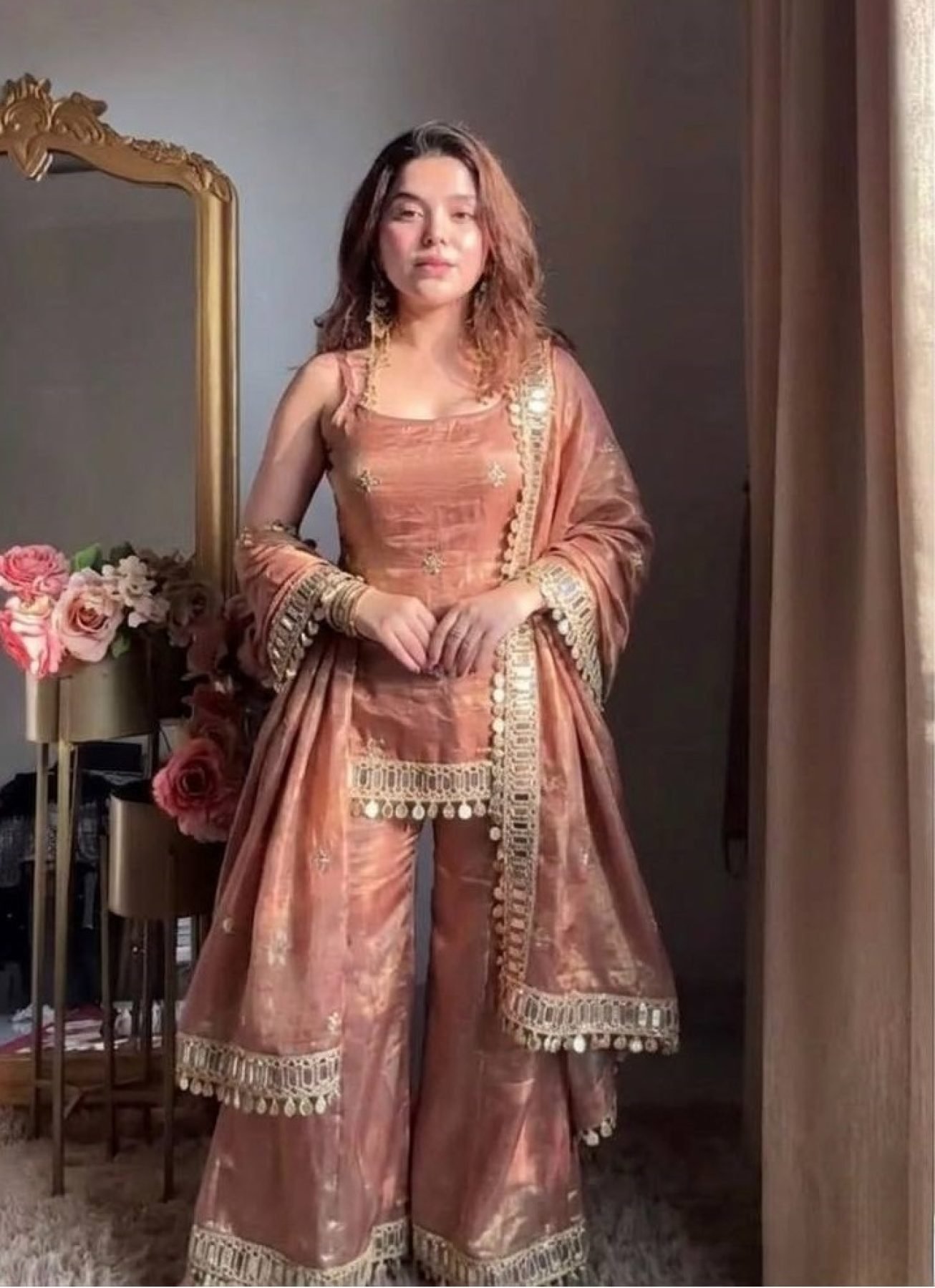 Nude Rose Dusty Pink Fendy Silk Embroidered Mirror Work Top with Sharara Plazzo and Dupatta
