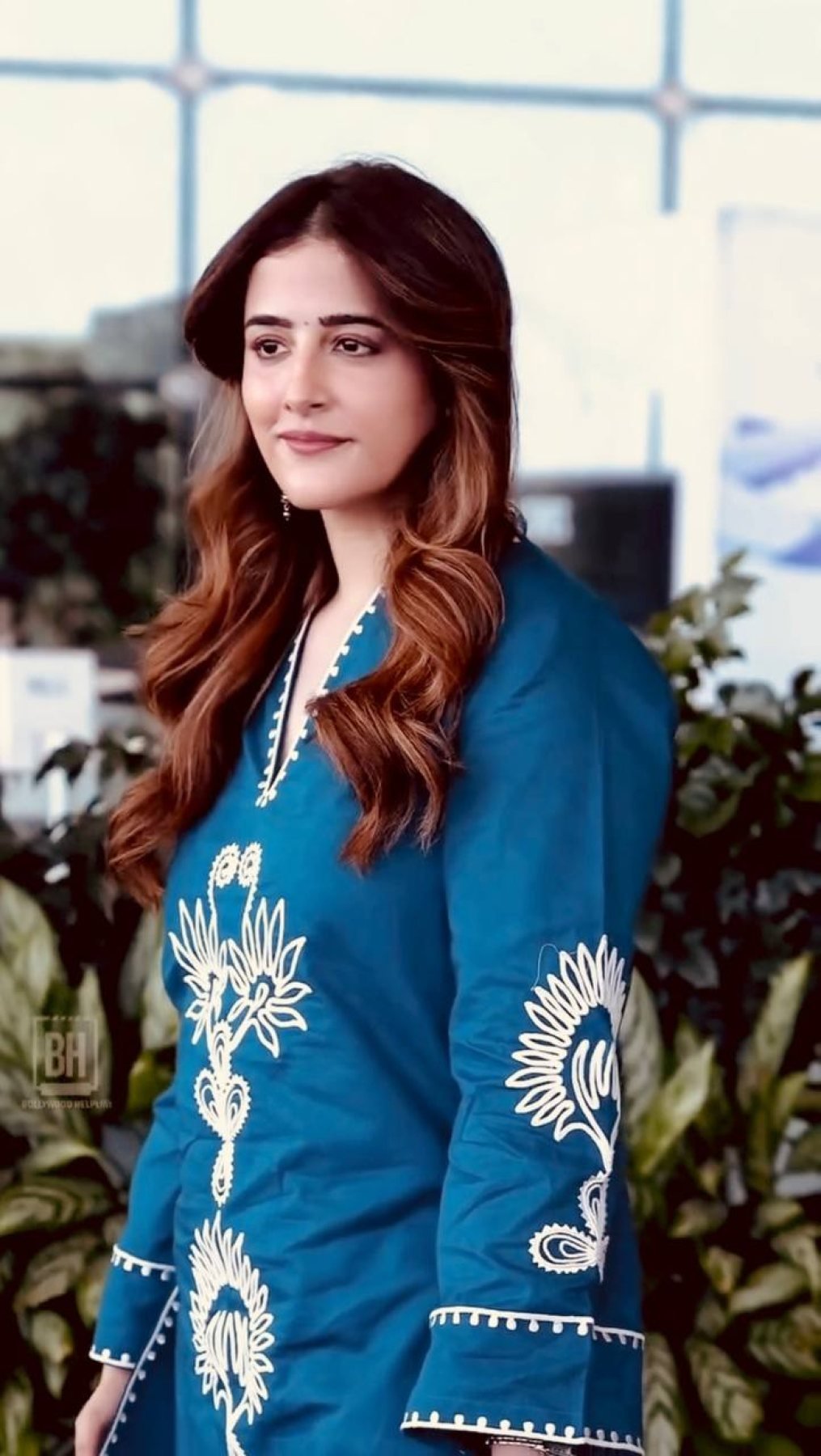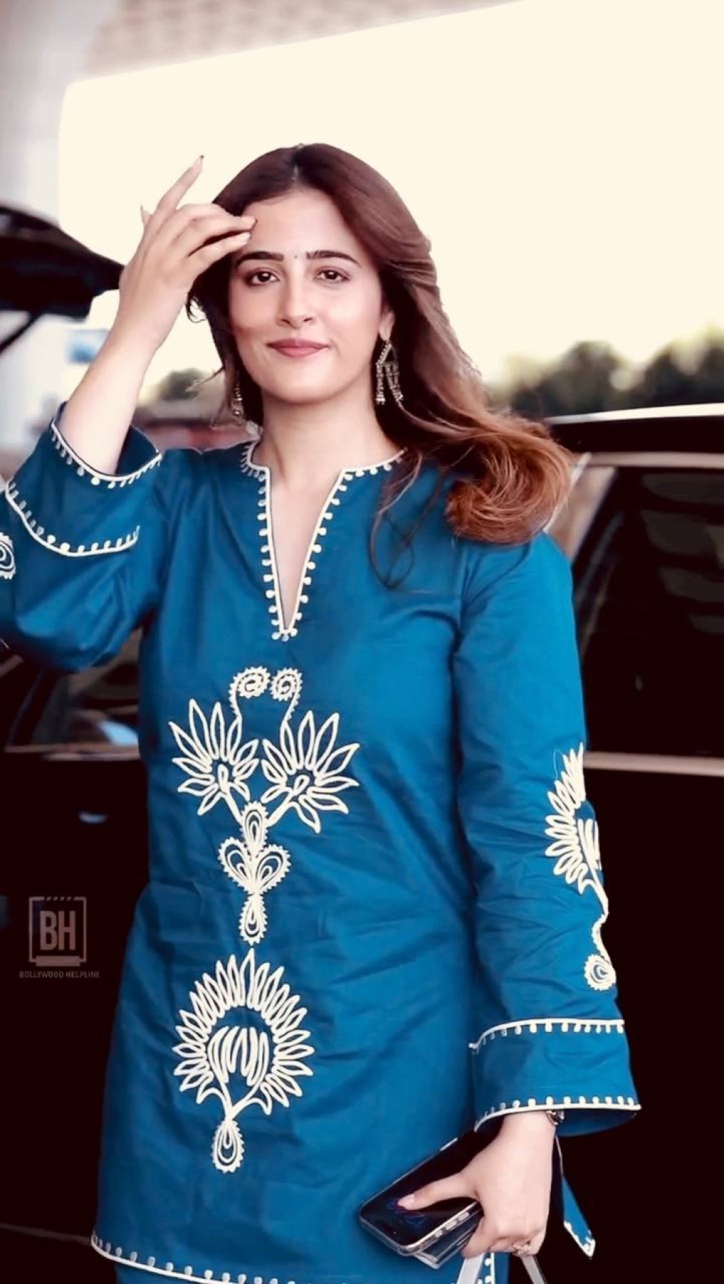 Nupur Sanon Wearing Teal Blue Cotton Embroidered Kurta with Notch Neckline