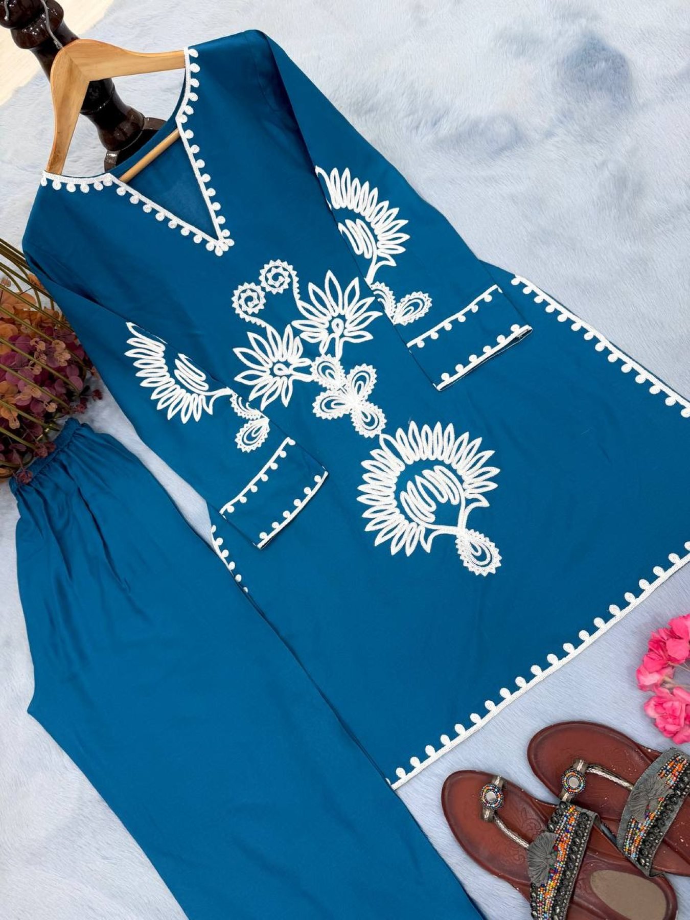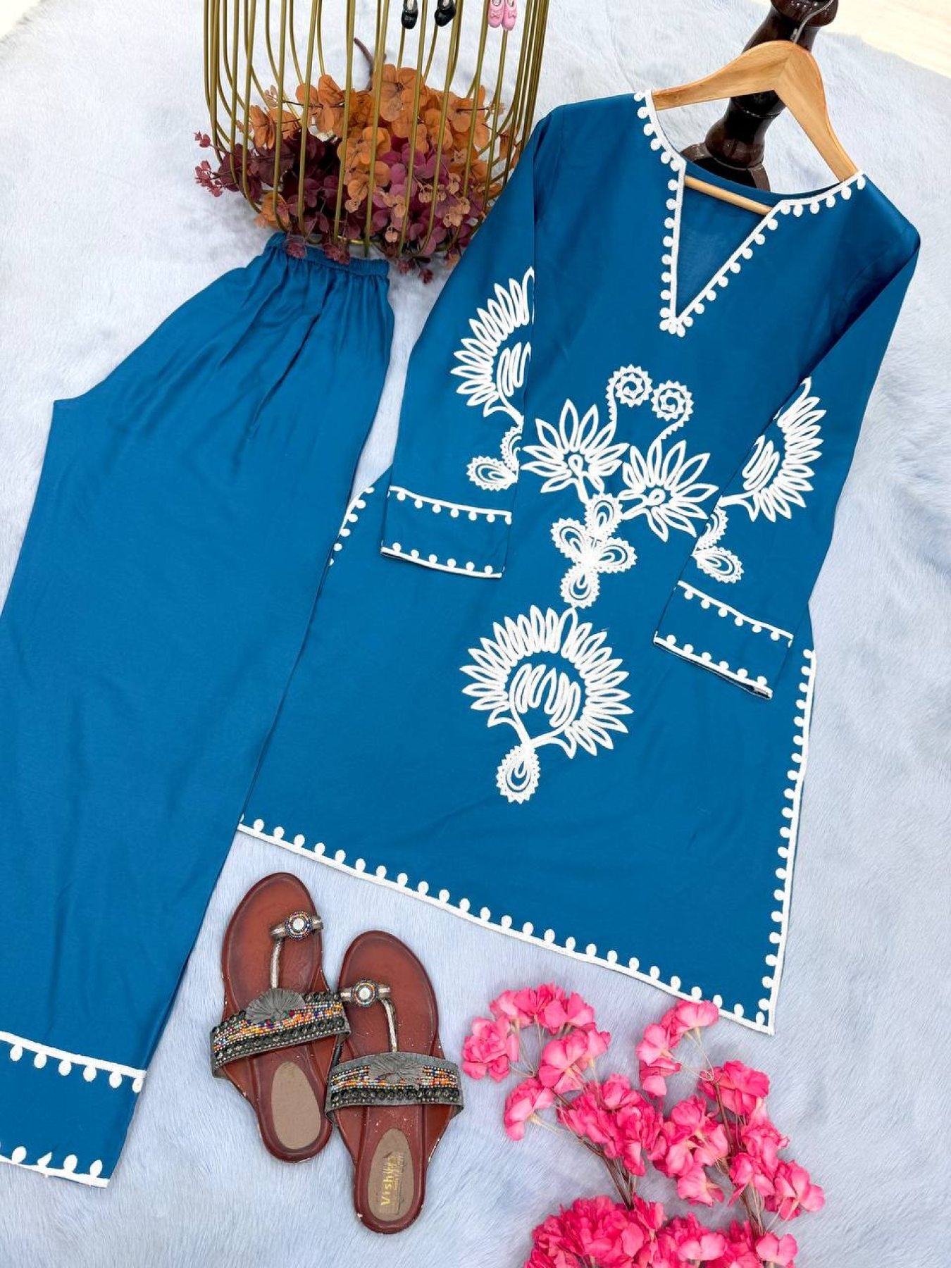 Stylish rayon co-ord set featuring elegant embroidery thread work on both top and plazzo. Designed with a comfortable fit and breathable fabric, this outfit is perfect for daily wear, office wear, and casual outings.