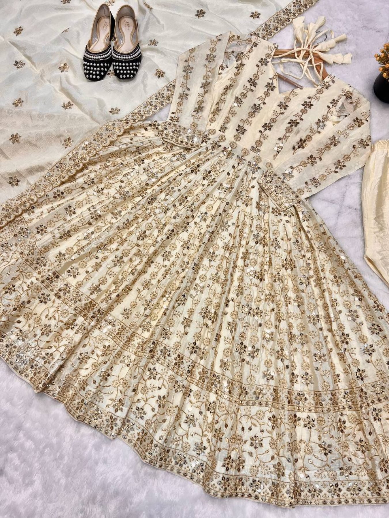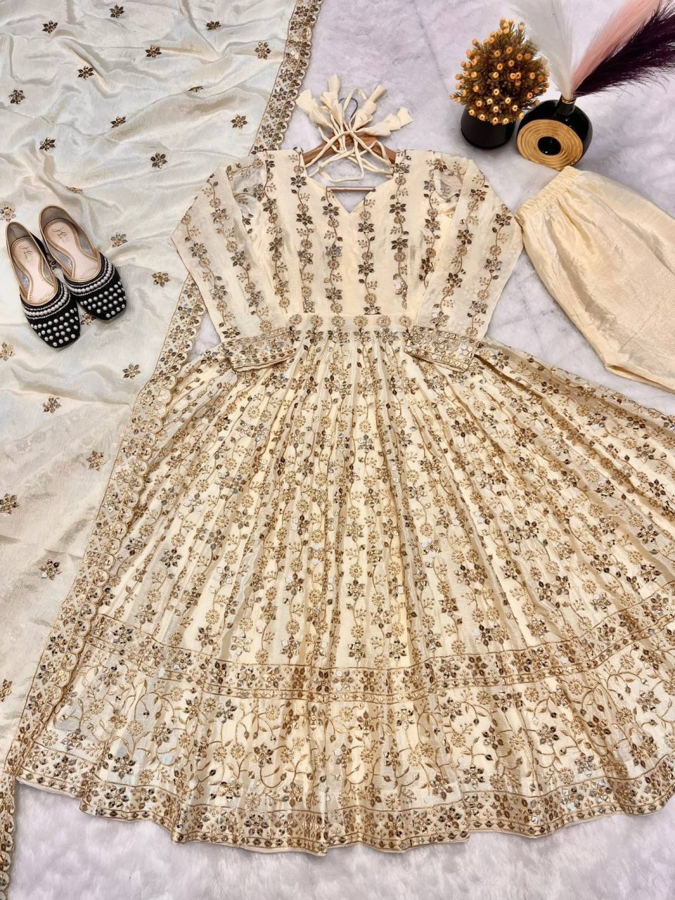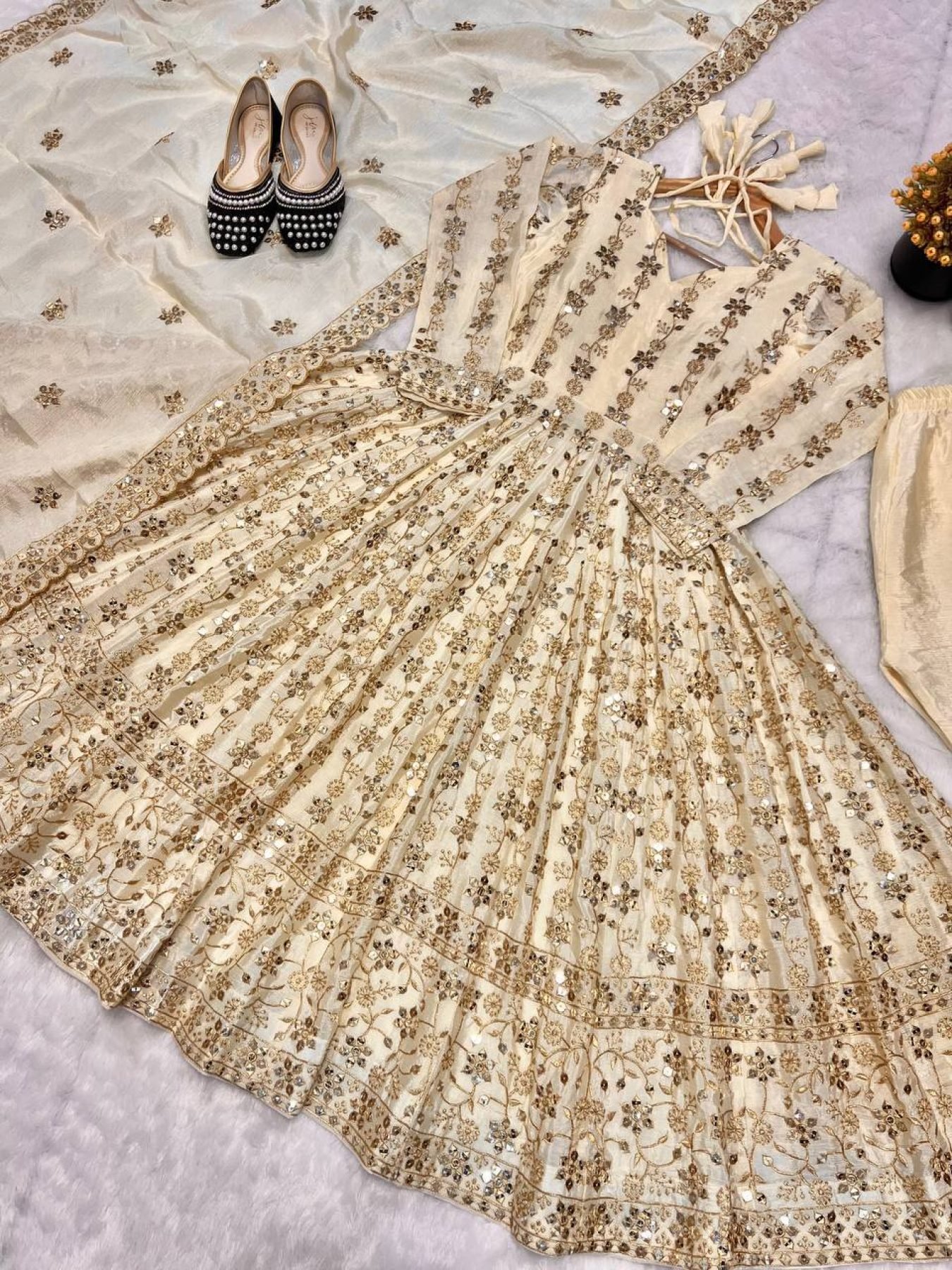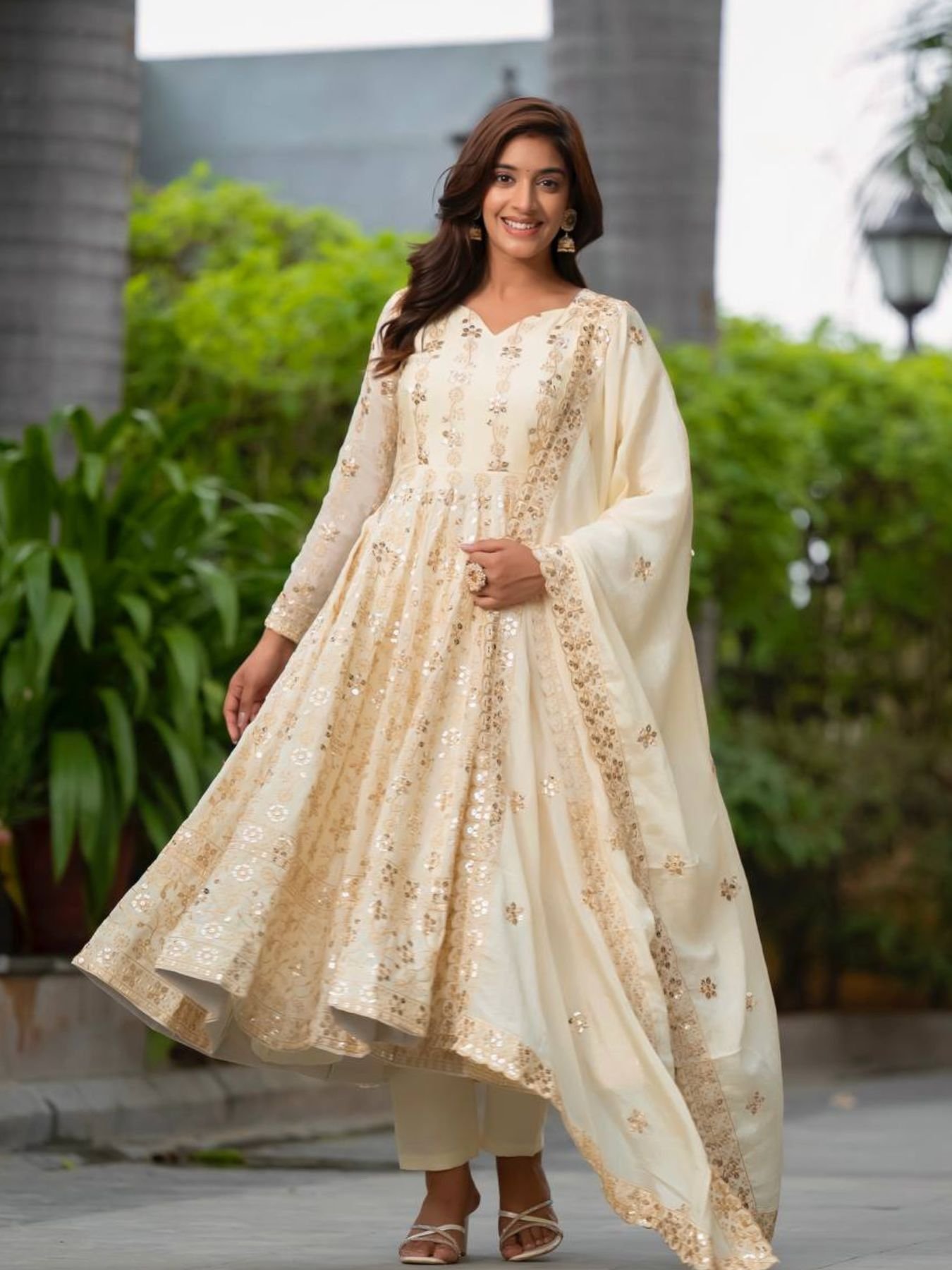 Off White Georgette Anarkali Suit With Heavy Sequin Embroidery Ready To Wear 3 Piece Set At Best Wholesale Price