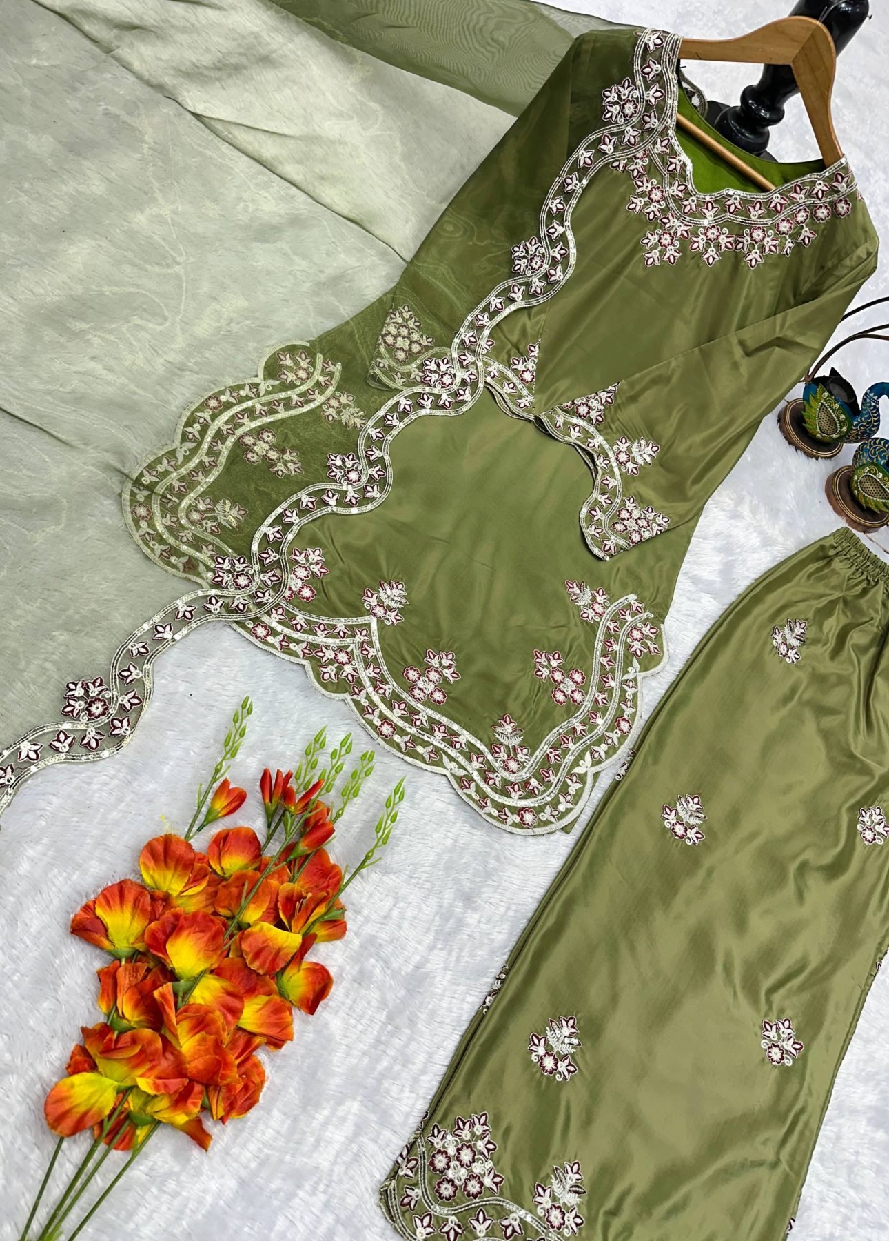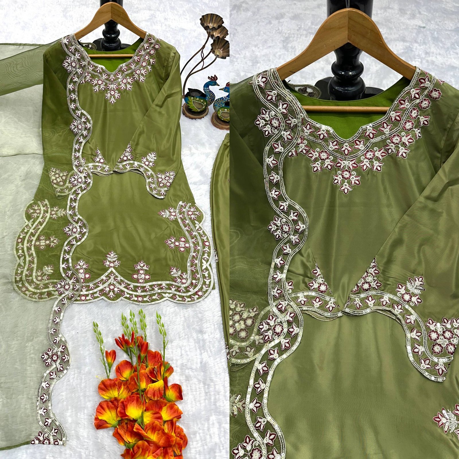 Olive Green Silk Blend Embroidered Salwar Kameez Set For Festive Wear