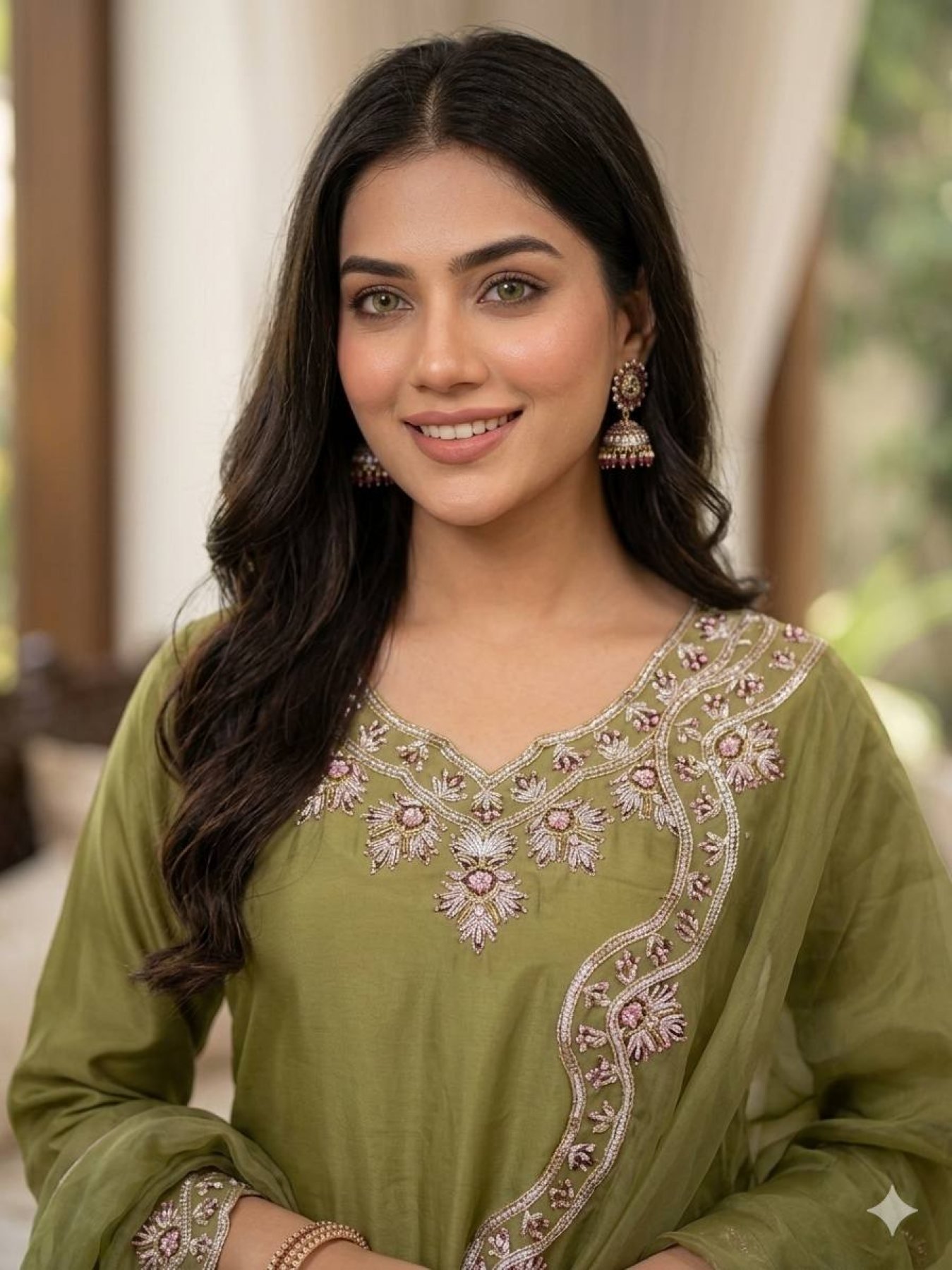 Premium natural crepe suit set featuring heavy embroidery and cut work on top, paired with embroidered plazzo and rich organza silk dupatta. Perfect for wedding, festive, and party wear with a stylish designer look.