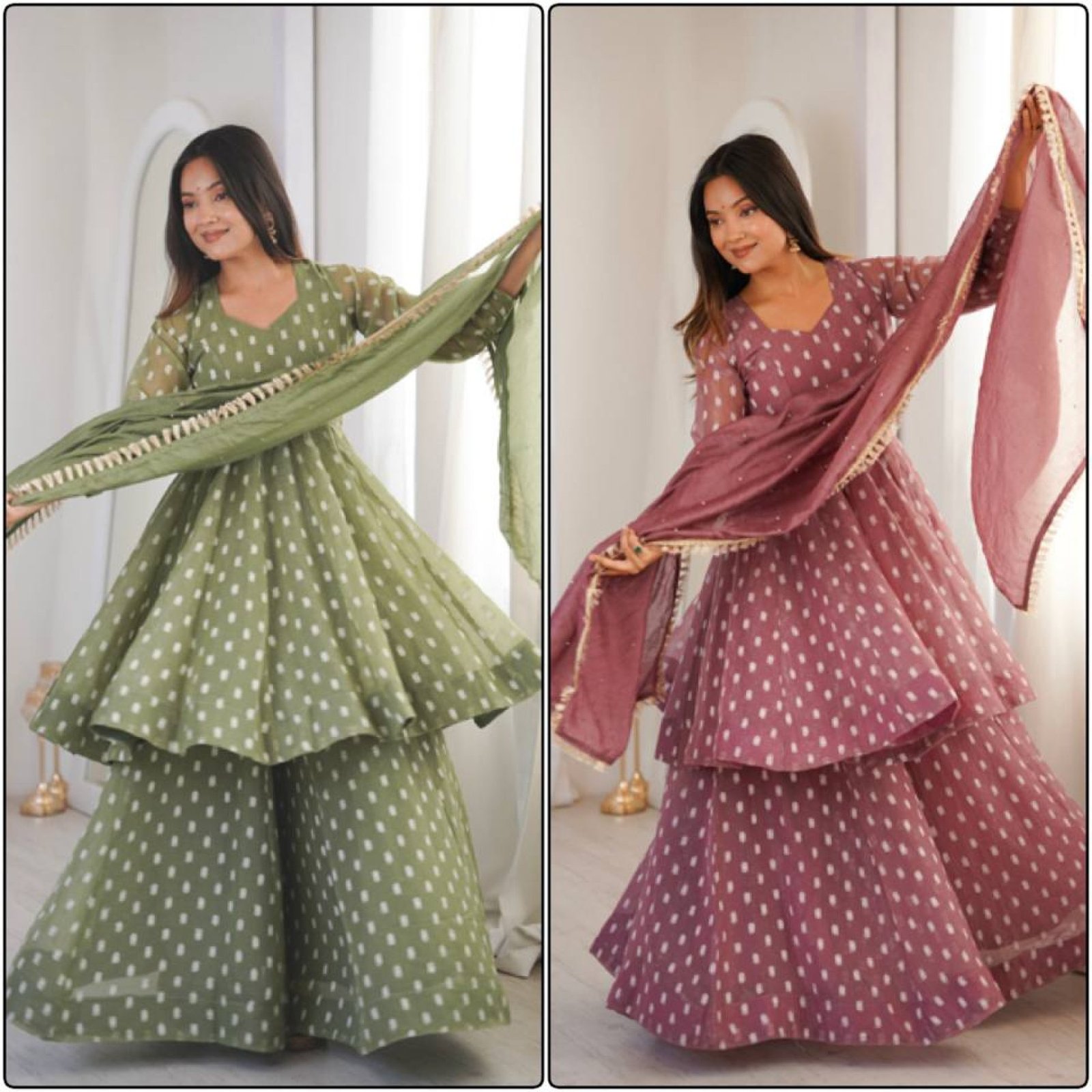 Premium crunchy silk sharara suit set featuring jacquard butti work with matching dupatta and lace border. Perfect for festive and party wear.