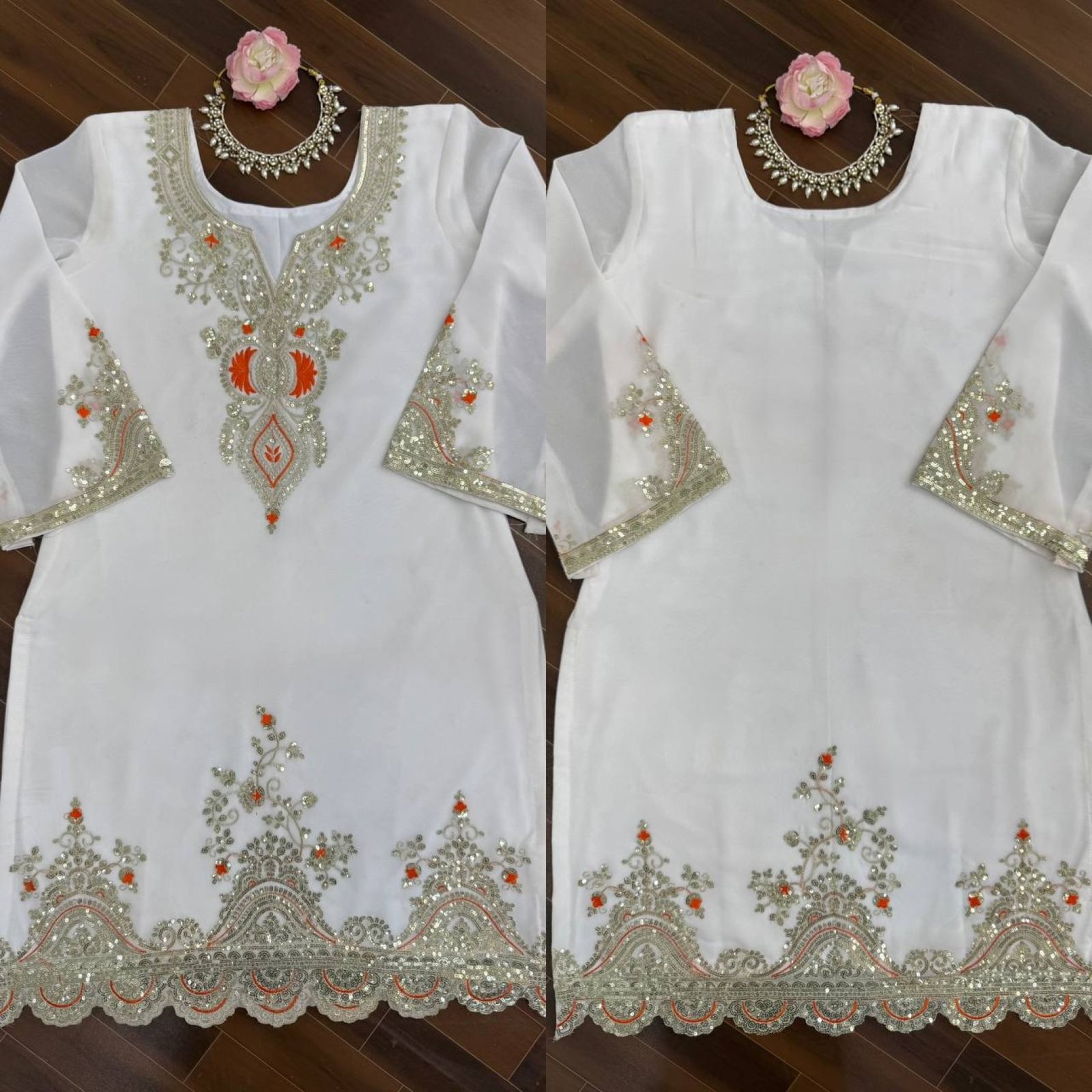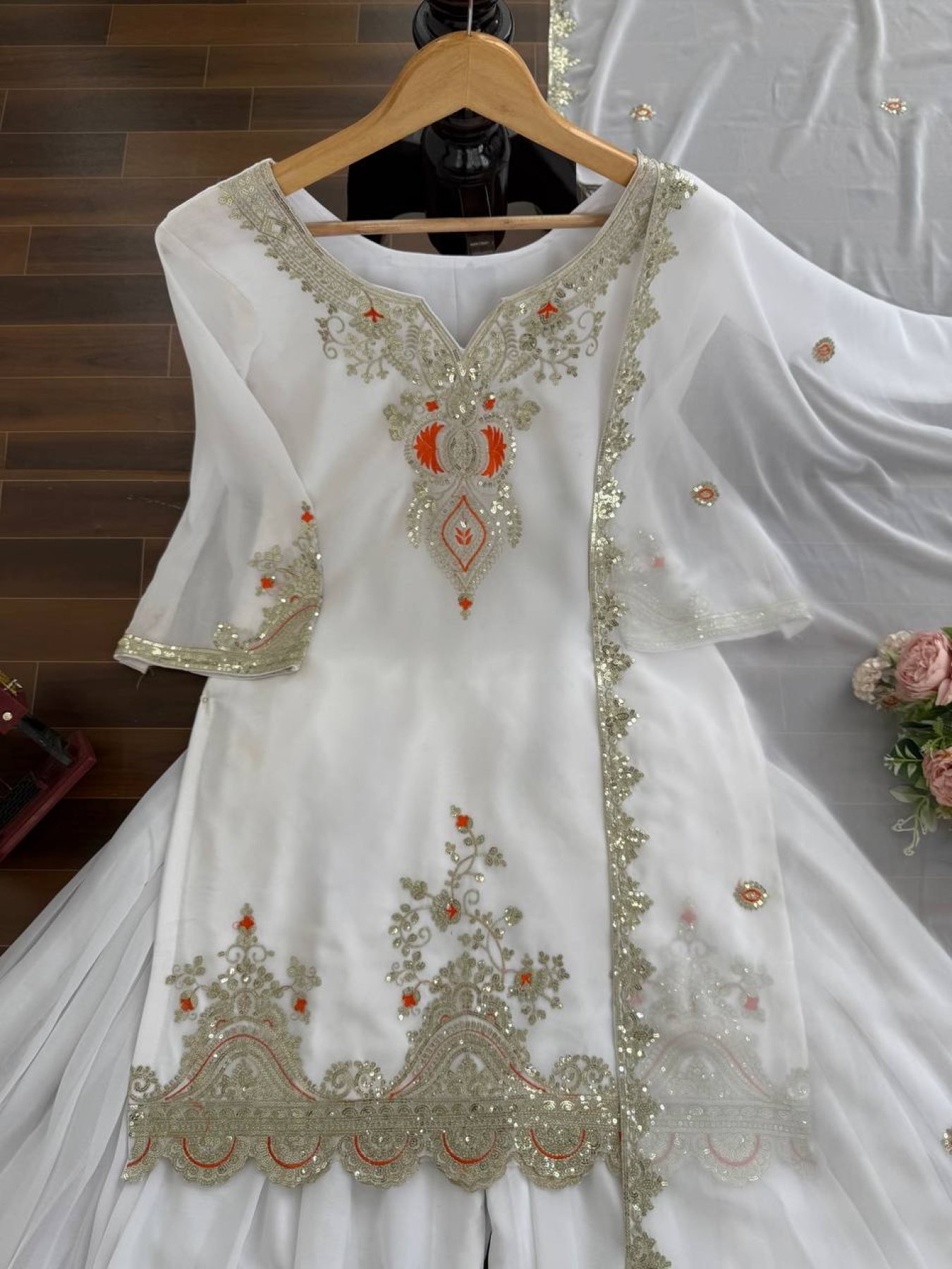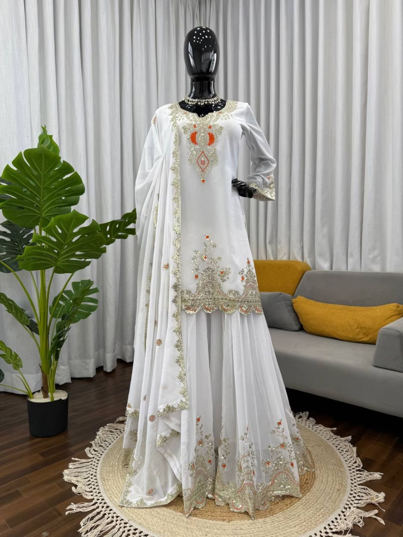 Opulent White Thread and Sequence Faux Georgette Sharara Suit for Wedding Collection