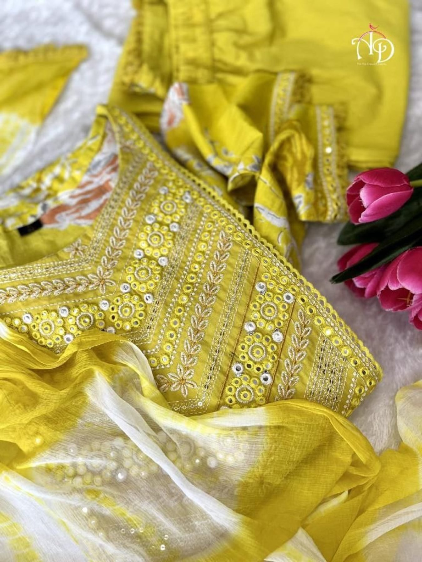 It is paired with matching pants and chiffon tie-dye dupatta For all the stylish ladies out there, who want something simple, sophisticated and traditional.