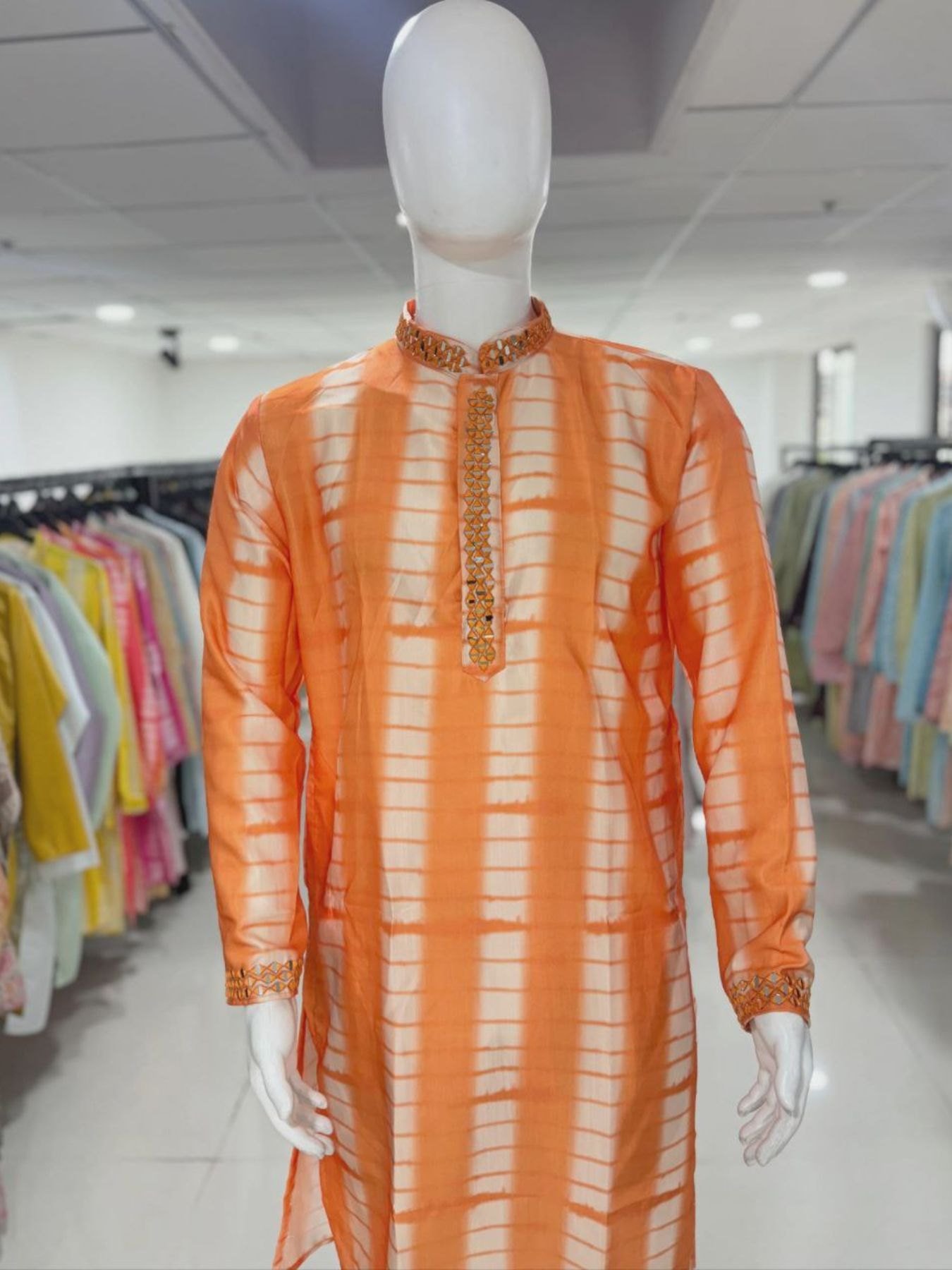 Orange Designer Royal Silk Kurta Pajama Set with Embroidered Neck Ready to Wear for Diwali Celebrations